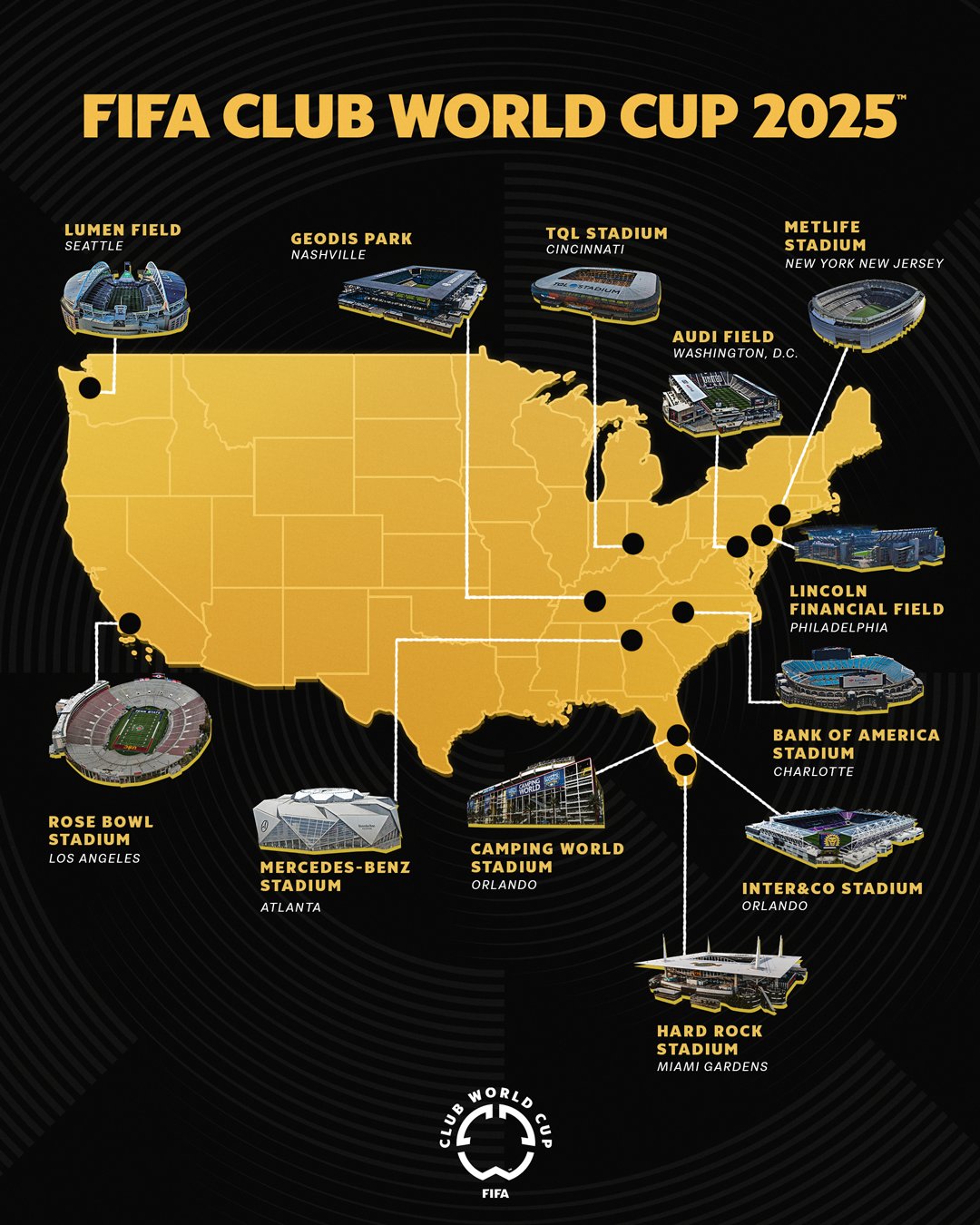 2025 FIFA Kulüpler Dünya Kupası; ABD’nin 11 farklı eyaletinde, 12 farklı statta oynanacak. Bu statlar arasında; Bank of America Stadyumu, Camping World, Hard Rock Stadyumu, Audi Field, Inter&Co Stadyumu, Lincoln Financial Field, Lumen Field, Mercedes-Benz Stadyumu, Rose Bowl Stadyumu, TQL Stadyumu, Geodis Park ve MetLife Stadyumu yer aldı. Aynı zamanda MetLife Stadyumu final maçına da ev sahipliği yapacak.