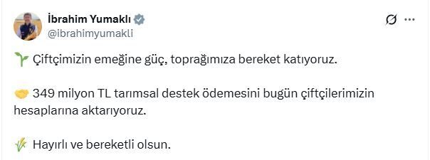 Tarım ve Orman Bakanı İbrahim Yumaklı, çiftçilere yönelik yeni tarımsal destek ödemelerinin bugün yapılacağını açıkladı. Bakan Yumaklı, sosyal medya hesabı üzerinden yaptığı paylaşımda, toplamda 349 milyon TL’lik desteğin çiftçilerin hesaplarına aktarılacağını bildirdi.