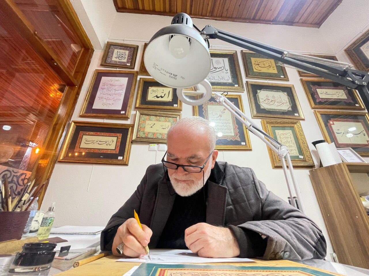Ekrem Uslu (67), 37 yıldır biriktirdiği hat tabloları koleksiyonuna kendi eserlerini de katmak için 60 yaşında hat sanatını öğrenmeye başladı. Yıllarca esnaflık yapan, 7 senedir hat öğrencisi olan Uslu, 100 eserin bulunduğu koleksiyonunun yanına, Tarihi Tahtakale Mahallesi’ndeki atölyesinde yaptığı hat çizimlerini de eklemek istiyor.