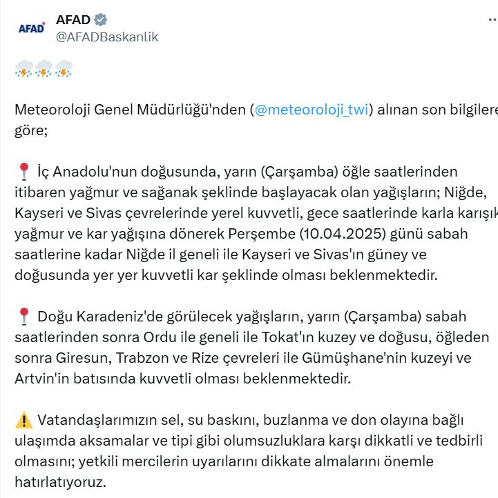 AFAD’dan yapılan açıklamada, Meteoroloji Genel Müdürlüğü’nün son meteorolojik değerlendirmelerine göre; İç Anadolu’nun doğusunda, yarın (Çarşamba) öğle saatlerinden itibaren yağmur ve sağanak şeklinde başlayacak olan yağışların; Niğde, Kayseri ve Sivas çevrelerinde yerel kuvvetli, gece saatlerinde karla karışık yağmur ve kar yağışına dönerek Perşembe (10.04.2025) günü sabah saatlerine kadar Niğde il geneli ile Kayseri ve Sivas’ın güney ve doğusunda yer yer kuvvetli kar şeklinde olması beklendiği belirtildi. Doğu Karadeniz’de görülecek yağışların ise yarın (Çarşamba) sabah saatlerinden sonra Ordu ile geneli ile Tokat’ın kuzey ve doğusu, öğleden sonra Giresun, Trabzon ve Rize çevreleri ile Gümüşhane’nin kuzeyi ve Artvin’in batısında kuvvetli olması beklendiği belirtildi. Yapılan açıklamada, “Vatandaşlarımızın sel, su baskını, buzlanma ve don olayına bağlı ulaşımda aksamalar ve tipi gibi olumsuzluklara karşı dikkatli ve tedbirli olmasını; yetkili mercilerin uyarılarını dikkate almalarını önemle hatırlatıyoruz” denildi.