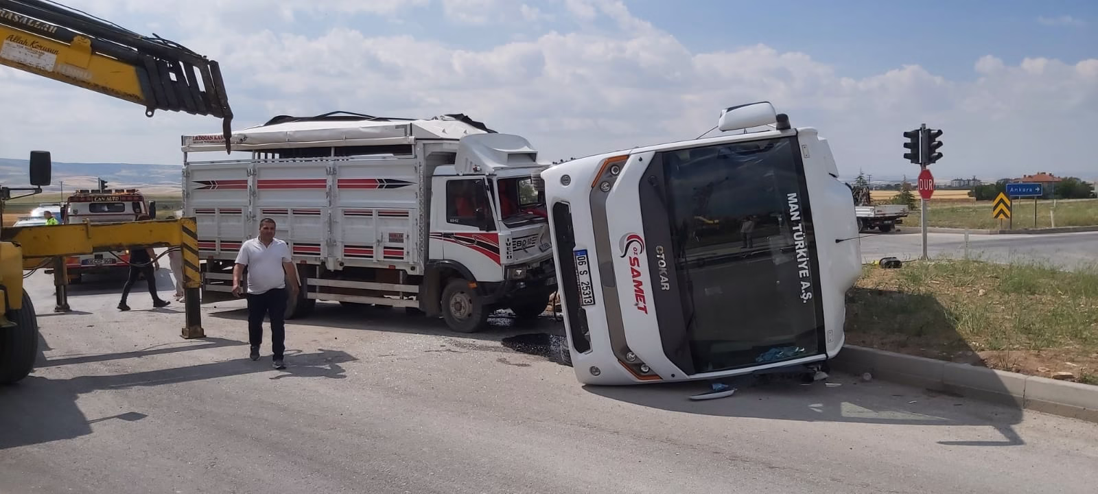 Çubuk ilçesinde kavşakta meydana gelen kazada kamyonet ile işçi servis minibüsü çarpıştı. Minibüs devrilirken, kamyonetteki 8 büyükbaş hayvan yola savruldu. 3 kişi yaralandı.