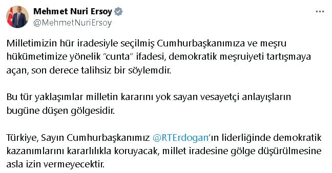 Bakan Ersoy, sosyal medya hesabı üzerinden yaptığı paylaşımda, “Milletimizin hür iradesiyle seçilmiş Cumhurbaşkanımıza ve meşru hükümetimize yönelik ‘cunta’ ifadesi, demokratik meşruiyeti tartışmaya açan, son derece talihsiz bir söylemdir. Bu tür yaklaşımlar milletin kararını yok sayan vesayetçi anlayışların bugüne düşen gölgesidir. Türkiye, Sayın Cumhurbaşkanımız Recep Tayyip Erdoğan’ın liderliğinde demokratik kazanımlarını kararlılıkla koruyacak, millet iradesine gölge düşürülmesine asla izin vermeyecektir” ifadelerini kullandı.