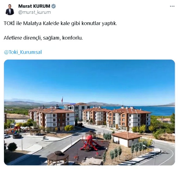 TOPLU Konut İdaresi (TOKİ) Başkanlığı’nın 2020 Elazığ depreminin ardından Malatya’nın Kale ilçesine yaptığı konutlar, 6 Şubat Kahramanmaraş depremlerinde de 16 Ekim’de meydana gelen 5,9 büyüklüğündeki Kale merkezli depremde hasar görmedi. İlçeden görüntüleri sosyal medya hesabından paylaşan Çevre, Şehircilik ve İklim Değişikliği Bakanı Kurum, “TOKİ ile Malatya Kale’de, kale gibi konutlar yaptık. Afetlere dirençli, sağlam, konforlu” dedi.