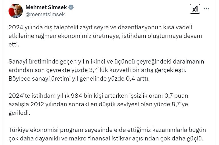 Hazine ve Maliye Bakanı Mehmet Şimşek, “2024’te istihdam yıllık 984 bin kişi artarken işsizlik oranı 0,7 puan azalışla 2012 yılından sonraki en düşük seviyesi olan yüzde 8,7’ye geriledi” dedi.