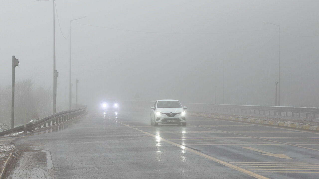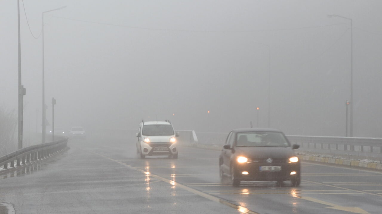 Bolu Dağı’nın D-100 kara yolu geçişinde hafif kar yağışı etkili olurken, sis nedeniyle de görüş mesafesi yaklaşık 30 metreye düştü.