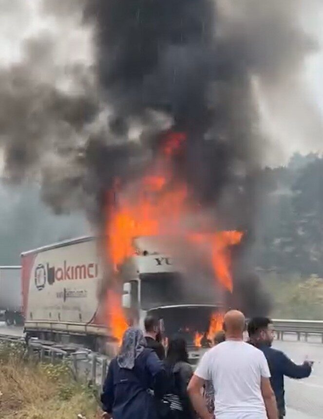 Kısa sürede büyüyen alevler, TIR’ın ön kısmını tamamen sardı. Çevredeki sürücülerin ihbarı üzerine olay yerine itfaiye ve polis ekipleri sevk edildi. İtfaiye ekiplerinin müdahalesiyle yangın kısa sürede kontrol altına alınarak söndürüldü.