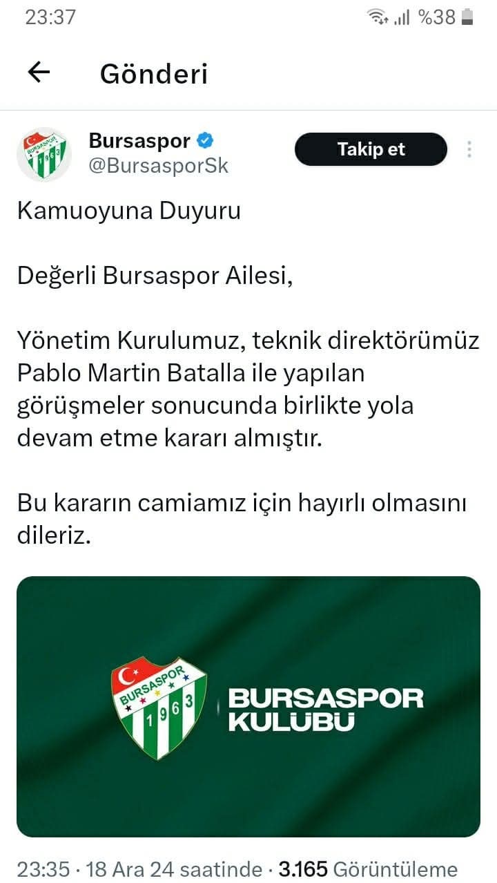 Bursa’da bir toplantı salonunda düzenlenen toplantıda, Bursaspor Başkanı Enes Çelik ve yönetim kurulu üyeleri Batalla ile bir araya geldi. Görüşmelerin ardından, yaşanan sorunların çözüldüğü ve Batalla ile devam etme kararı alındığı bildirildi. Bursaspor, sosyal medya hesabından yaptığı açıklamada, ‘’Değerli Bursaspor ailesi, Yönetim Kurulumuz, teknik direktörümüz Pablo Martin Batalla ile yapılan görüşmeler sonucunda birlikte yola devam etme kararı almıştır. Bu kararın camiamız için hayırlı olmasını dileriz” dedi.