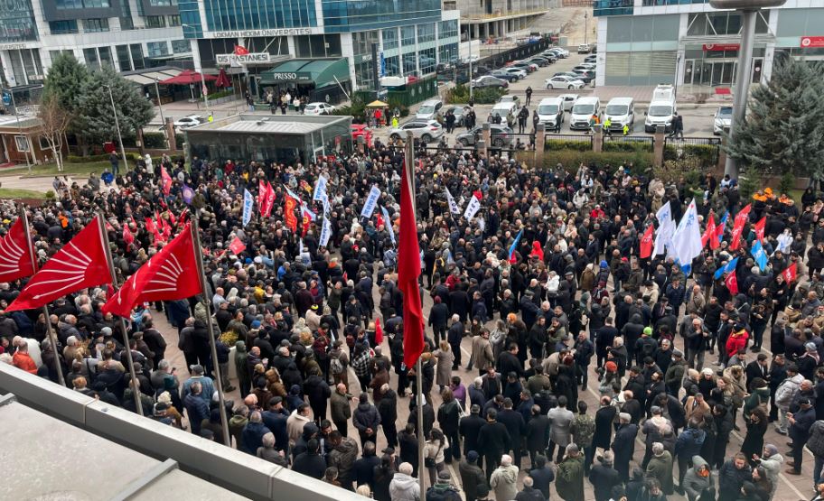 Partililer, Yücel’in konuşmasının ardından genel merkez önünde beklemeye devam etti. (DHA)