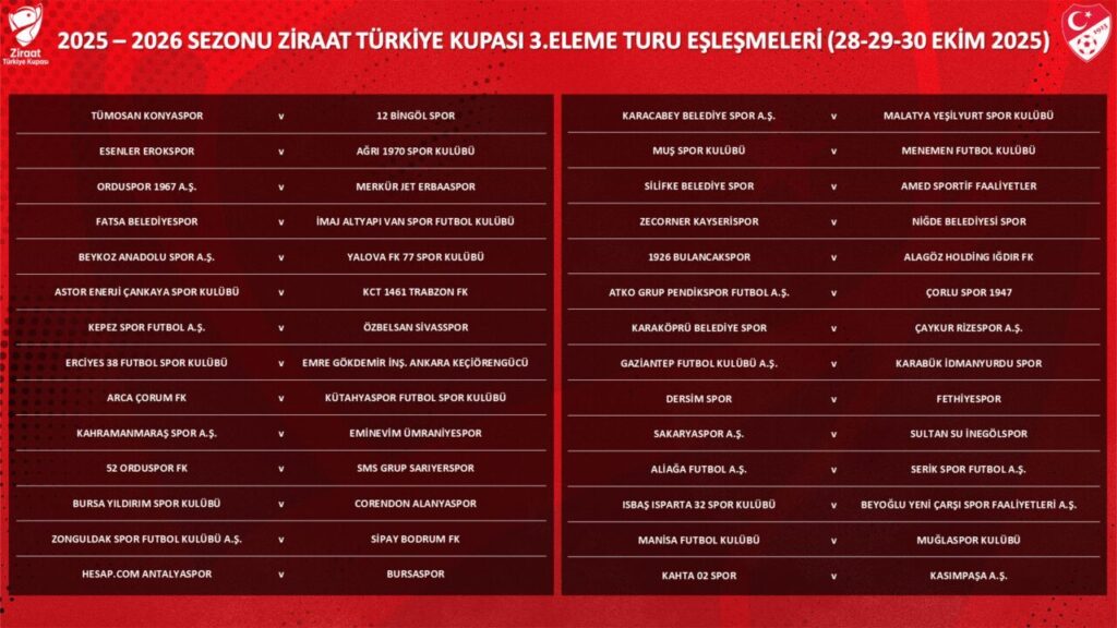 TFF Riva Hasan Doğan Tesisleri’nde gerçekleştirilen kura çekimiyle Ziraat Türkiye Kupası 3. Eleme Turu eşleşmeleri belli oldu. 56 takımın yer aldığı turda maçlar 28-30 Ekim’de oynanacak.