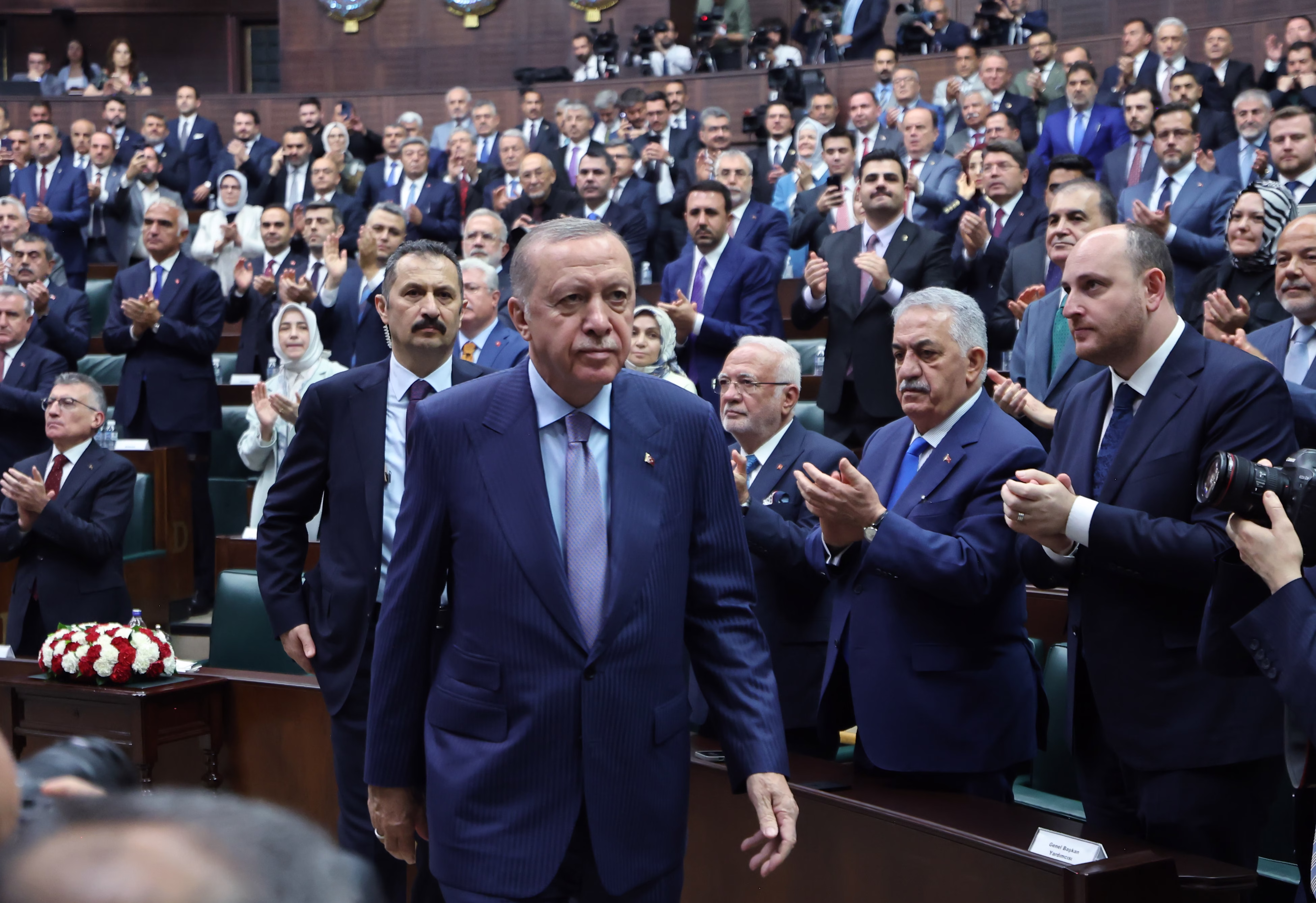Cumhurbaşkanı Erdoğan, Genel Kurul çalışmalarında artık yasama yılının sonuna yaklaşıldığını belirterek, “Gerek iç siyaset, gerek dış gelişmeler bağlamında oldukça yoğun geçen bir takvimi yavaş yavaş tamamlıyoruz. 1 Ekim’den bu yana gece gündüz demeden millete hizmet için çalıştınız. Muhalefetin, Meclisi engelleme girişimlerine rağmen bedenen ve ruhen tüm mesainizi Genel Kurul çalışmalarına tahsis ve teksif ettiniz. Sabrınızın zorlanmasına, sinirlerinizin gerilmesine, çeşitli emrivakilerle iradenize darbe yapılmak istenmesine aldırmadan, milletin emanetine layıkıyla sahip çıktınız. AK Parti ve Cumhur İttifakı olarak tam bir dayanışma içerisinde, milletimize karşı mesuliyetlerimizi yerine getirmenin gönül huzurunu yaşıyoruz. Meclis tatile girene kadar tempomuzu düşürmeden çalışacak ve gündemdeki 4 kanun teklifinin de inşallah yasalaşmasını sağlayacağız. Sizlerden kalan süreyi de en iyi şekilde değerlendirmenizi rica ediyorum” dedi.