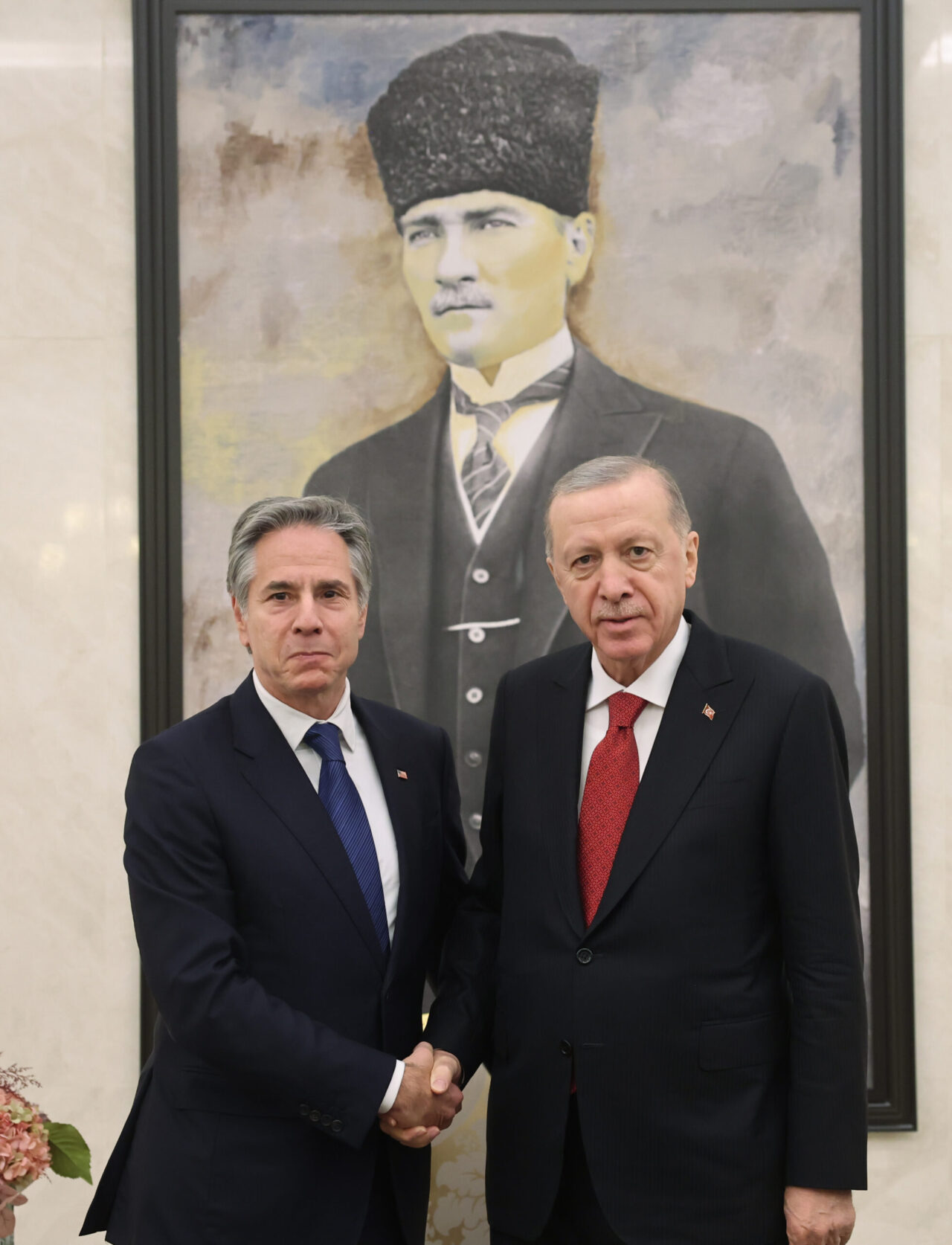 Cumhurbaşkanı Erdoğan, resmi ziyaret kapsamında Ankara’ya gelen ABD Dışişleri Bakanı Blinken’i kabul etti. Görüşmede Dışişleri Bakanı Hakan Fidan da yer aldı. Esenboğa Havalimanı’nda basına kapalı gerçekleşen görüşmeye dair fotoğraf paylaşıldı.