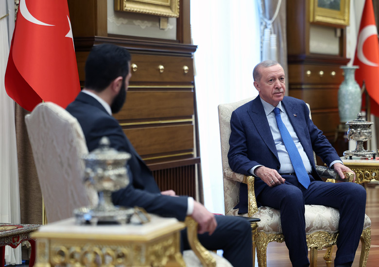 Cumhurbaşkanı Recep Tayyip Erdoğan, Ahmed Şara’yı Cumhurbaşkanlığı Külliyesi’nde karşıladı. Erdoğan ve Şara, merdivenlerde Türkiye bayrağı ve yeni Suriye bayrağı önünde fotoğraf çektirdi. Erdoğan ve Şara, ardından baş başa ve heyetler arası görüşmeye geçti. Görüşmelerin ardından ortak basın toplantısı düzenleneceği belirtildi.