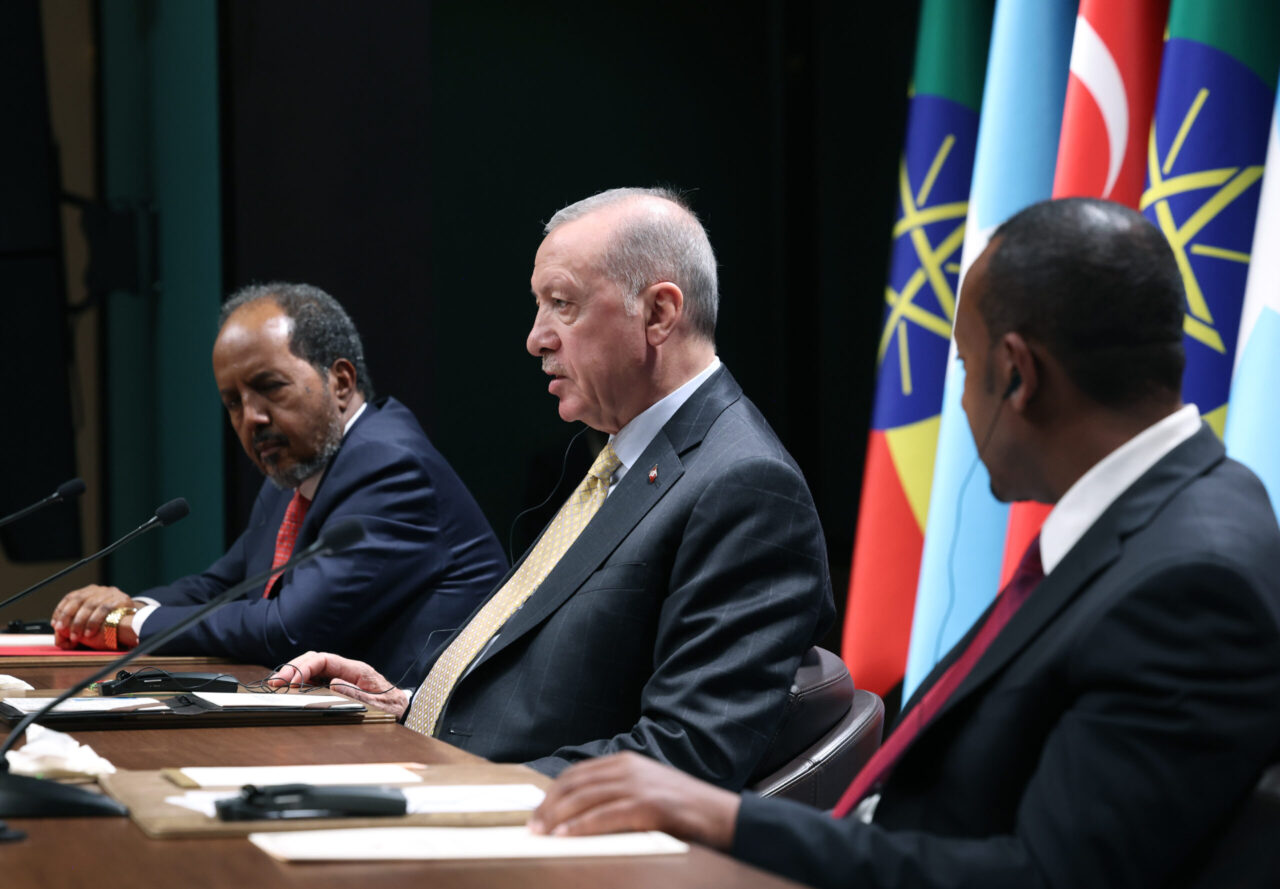 Cumhurbaşkanı Erdoğan, Somali Cumhurbaşkanı Hasan Şeyh Mahmud ve Etiyopya Başbakanı Abiy Ahmed ile Cumhurbaşkanlığı Külliyesi’nde bir araya geldi. Görüşmenin ardından ortak basın toplantısı düzenlendi. Toplantıda konuşan Cumhurbaşkanı Erdoğan, Somali ve Etiyopya’nın Türkiye’ye duydukları güven neticesinde bundan yaklaşık 8 ay önce başlatılan, ‘Ankara Süreci’nde önemli bir aşamaya geldiklerini belirterek, “Böylece bir takım kırgınlıkları ve yanlış anlamaları beraberce aşmak suretiyle Somali ve Etiyopya arasında barış ve iş birliğine dayalı yeni bir başlangıcın ilk adımını atmış olduk. Ülkelerin egemenliği, birliği ve toprak bütünlüğünün sağlanmasına yönelik ilkesel tutumumuzun bir sembolü olarak Afrika’nın bu güzide köşesinde barış ve istikrarın sağlanması temel beklentimizdir. Mayıs ayından itibaren tarafların rızasıyla Dışişleri Bakanlarımız iki defa Ankara’da bir kerede Birleşmiş Milletler Genel Kurulu vesilesiyle Türk Evi’nde bir araya geldiler. Yüz yüze yapılan bu toplantıların yanı sıra birçok kez de telefon irtibatımız oldu. Tüm bu süreç boyunca tarafların hassasiyetlerini, önceliklerini ve beklentilerini dikkatli dinledik. Her iki ülkenin değerli katkılarıyla da bugün mutabık kaldığımız ortak bildiri metnini ortaya çıkardık. Bu ortak bildiri geçmişe değil, geleceğe odaklanmakta bizim için çok önem taşıyan bu iki dost ülkenin bundan sonra inşa edecekleri ilkeleri kayda geçirmektedir” ifadelerini kullandı.