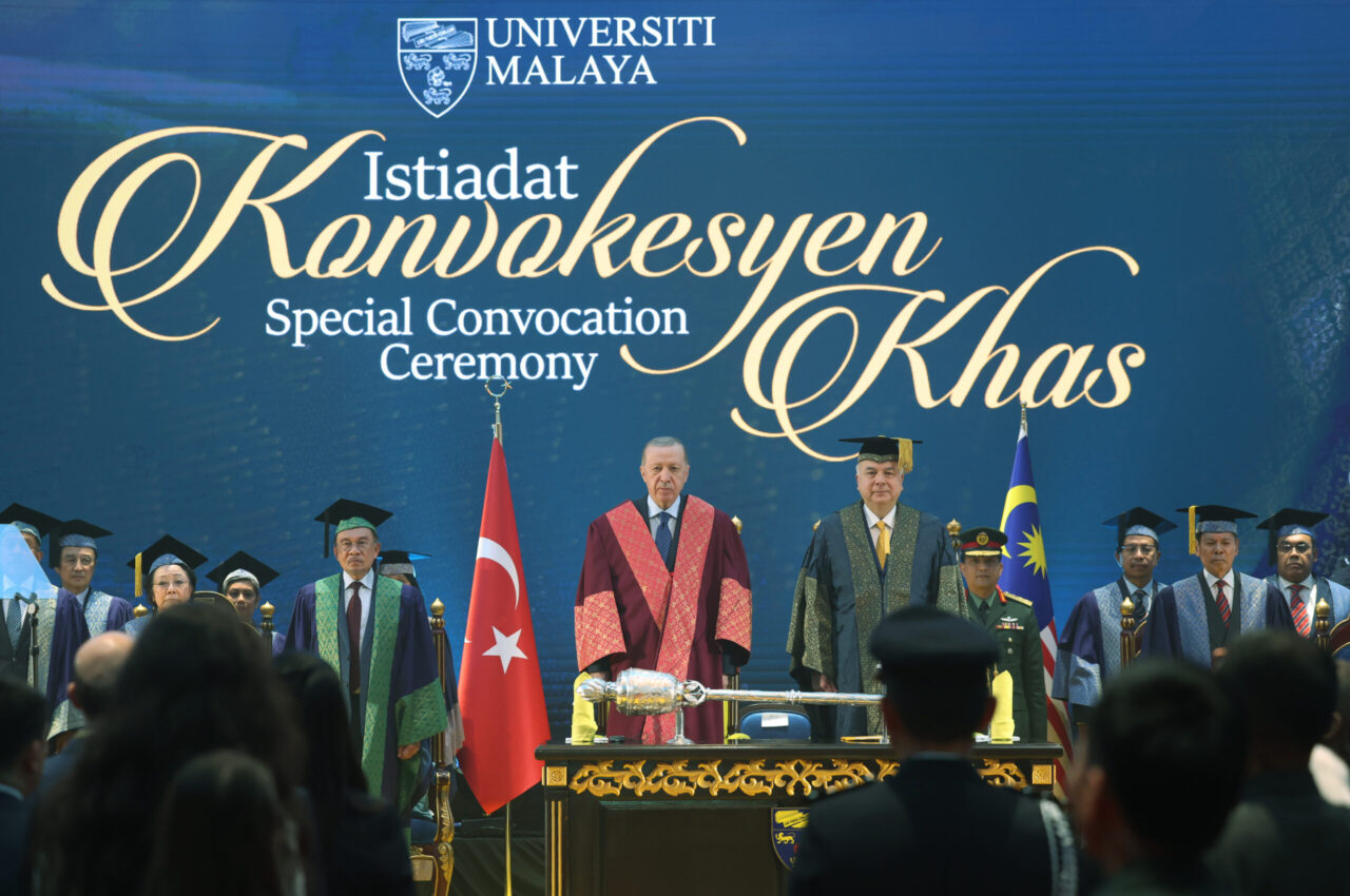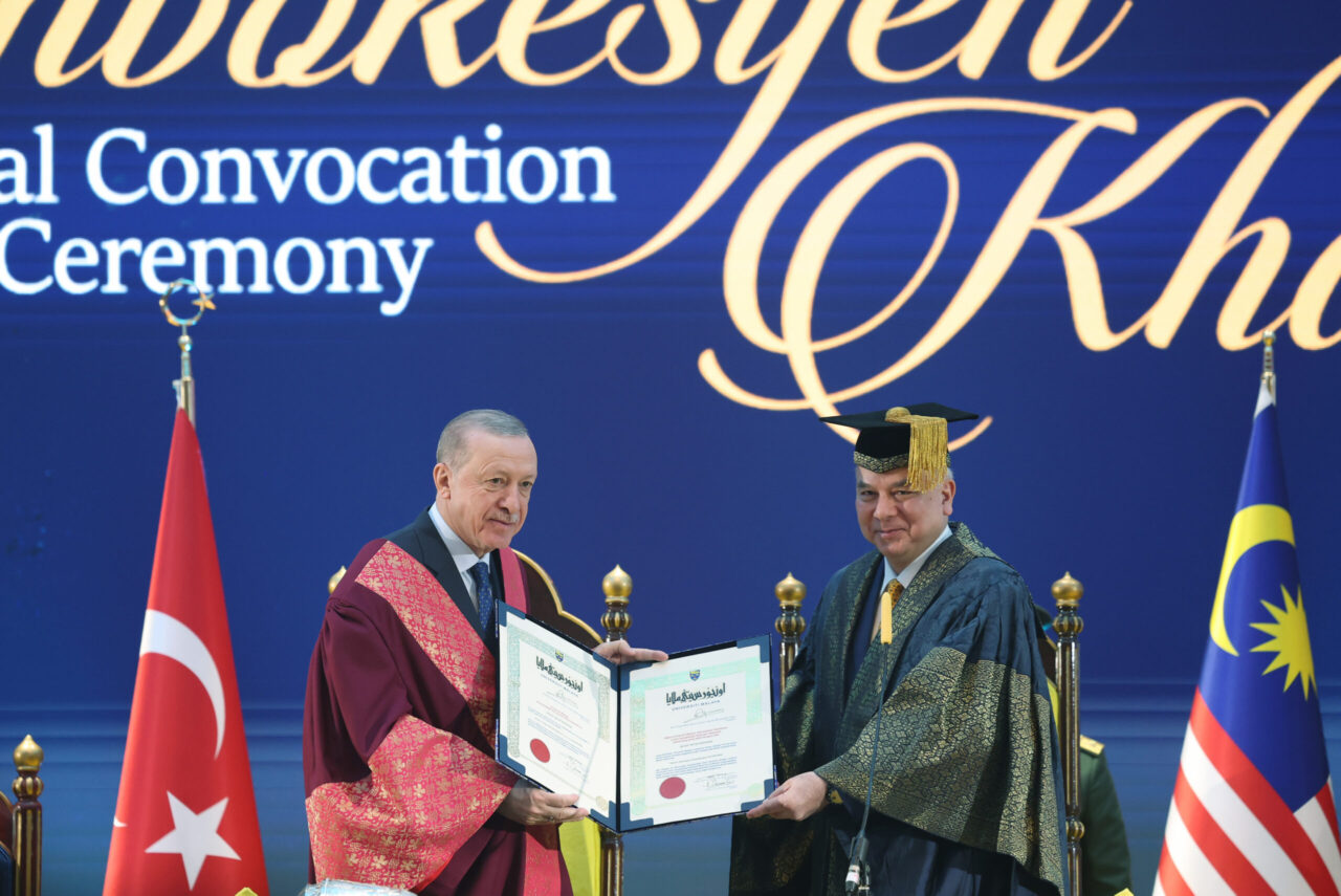 Cumhurbaşkanı Recep Tayyip Erdoğan’a Malezya’da, Putrajaya Uluslararası Kongre Merkezi’nde Perak Sultanı Nazrin Şah tarafından fahri doktora beratı verildi.