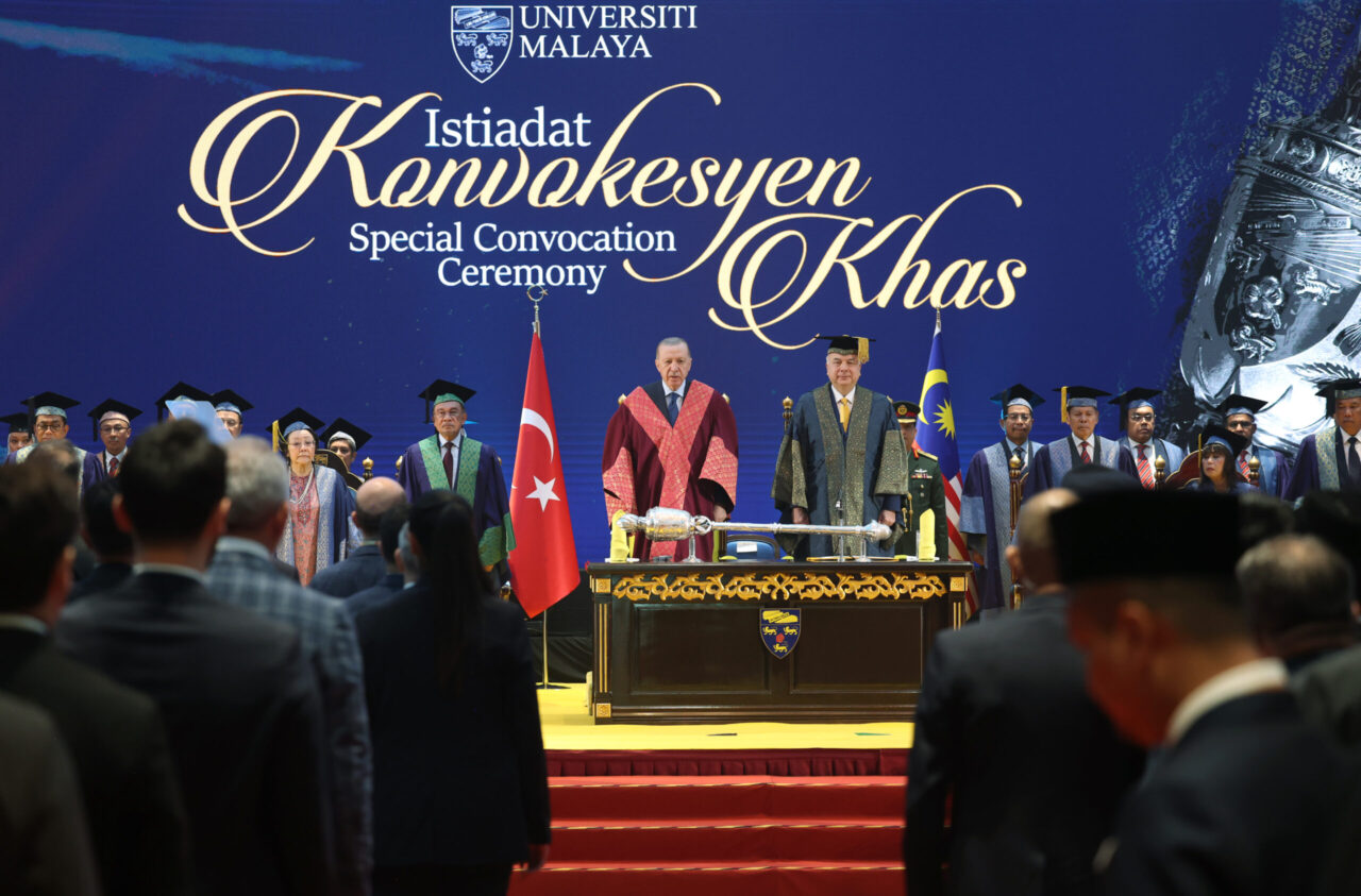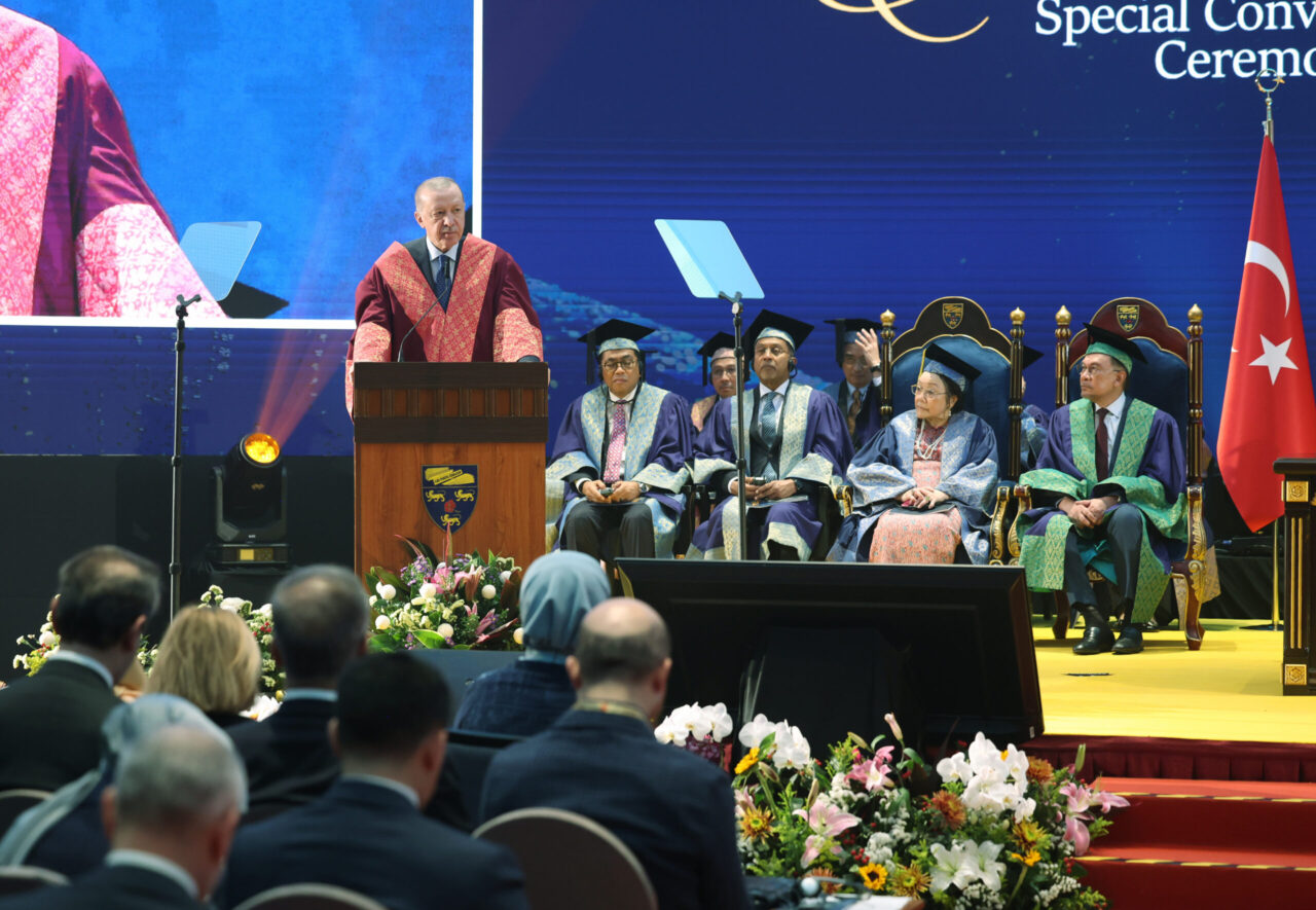Cumhurbaşkanı Erdoğan, fahri doktoranın takdiminden sonra Malezya’da ‘Yeni Yüzyılda Türkiye-Malezya Stratejik İşbirliği’ toplantısı kapsamında kamu çalışanları ve üniversite öğrencilerine hitap etti. Erdoğan, “Beş yıl aradan sonra dost ve kardeş Malezya’da tekrar bulunmaktan duyduğum memnuniyeti ifade ederek sözlerime başlamak istiyorum. Güzel ülkenize her gelişimizde kendimizi evimizde kardeşler arasında hissediyoruz. Rabbim aramızdaki dayanışma ve muhabbeti daim eylesin diyorum. Asya’nın iki yakasında yer alan Türkiye ve Malezya coğrafi uzaklığa rağmen esasen birbirlerinin dost, kardeş ve aynı zamanda ortağıdır. Bu ortaklığı 2014 yılında stratejik, 2022 yılında ise kapsamlı stratejik düzeye çıkardık. Ülkelerimiz arasındaki iş birliğinin önemli boyutlarından birini eğitim ve beşeri ilişkiler oluşturuyor. Akademik münasebetlerimiz 1980’lerden bu yana ivme kazandı. Bir dönem ülkemize hakim olan yasakçı ve baskıcı zihniyet sebebiyle birçok gencimiz buraya geldi, eğitim aldı, akademik kariyer yaptı. Hamdolsun o günler artık geride kaldı” ifadelerini kullandı.