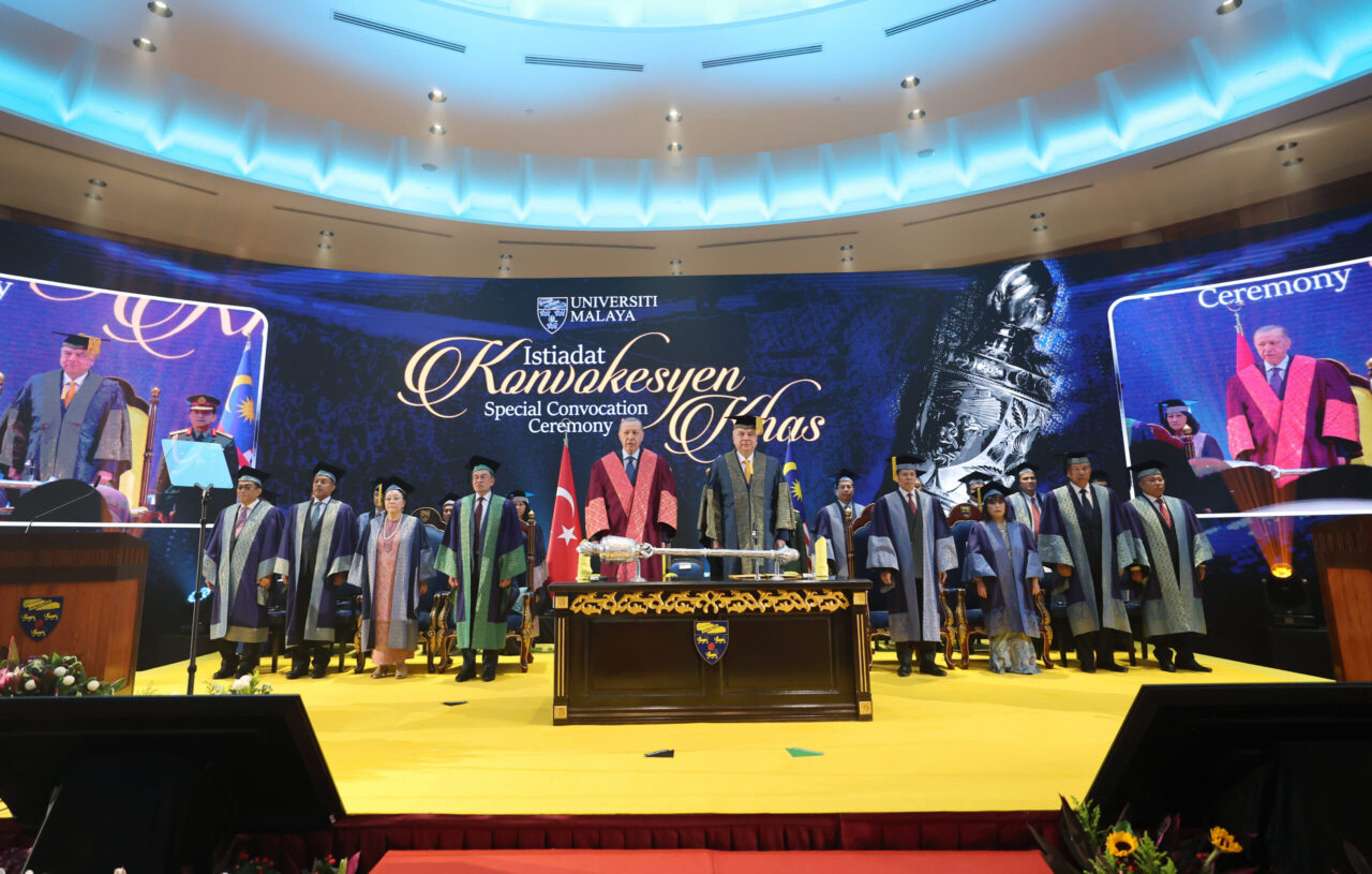 Cumhurbaşkanı Erdoğan, bugün Türkiye’nin, dünyanın 190’ı aşkın ülkesinden 340 bine yakın uluslararası öğrenciye yüksek öğrenim imkanı sunduğunu belirterek, “Çok sayıda genç kardeşimiz burslar sayesinde hem Türkiye’de hem Malezya’da öğrenim görmeye devam ediyor. Malezya’nın yükseköğretimde bir çekim haline gelmesinden sebeplerinden biri Malaya Üniversitesi’dir. 40 bin öğrencisiyle Malezya akademik hayatında seçkin bir rol oynuyor. Üniversiteler toplumun kalkınması için güçlü bir fonksiyona sahiptir. Aydınlık yarınlara zemin oluşturmaktadır. Malezya’nın iyi yetişmiş insan kaynağıyla gelecekte iyi yerlere geleceğine inanıyorum. Fahri doktora ünvanı dolayısıyla tüm üniversite yönetimine teşekkür ediyorum” diye konuştu.