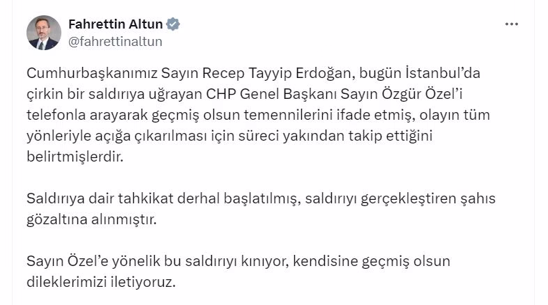 İletişim Başkanı Fahrettin Altun, sosyal medya hesabından yaptığı paylaşımda, Cumhurbaşkanı Erdoğan’ın görüşmeye dair detayları paylaştı. Altun, “Cumhurbaşkanımız Sayın Recep Tayyip Erdoğan, bugün İstanbul’da çirkin bir saldırıya uğrayan CHP Genel Başkanı Sayın Özgür Özel’i telefonla arayarak geçmiş olsun temennilerini iletmiş, olayın tüm yönleriyle açığa çıkarılması için süreci yakından takip ettiğini ifade etmiştir” açıklamasında bulundu.