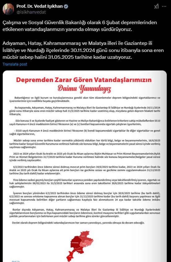 Çalışma ve Sosyal Güvenlik Bakanı Vedat Işıkhan, 6 Şubat depremleri nedeniyle Adıyaman, Hatay, Kahramanmaraş ve Malatya ile Gaziantep’in İslahiye ve Nurdağı ilçelerinde sona eren mücbir sebep halinin 31 Mayıs 2025’e kadar uzatıldığını duyurdu.