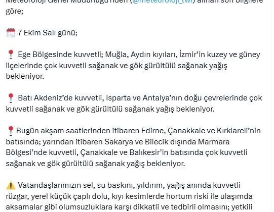 İçişleri Bakanlığı, Muğla, Aydın ve İzmir başta olmak üzere Ege Bölgesi genelinde çok kuvvetli sağanak ve gök gürültülü yağış beklendiğini duyurarak vatandaşları dikkatli olmaya çağırdı.