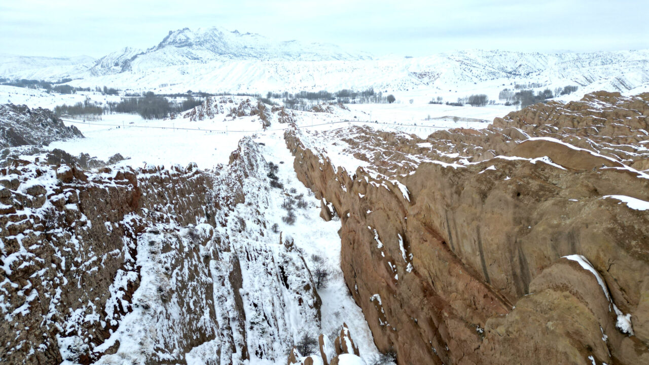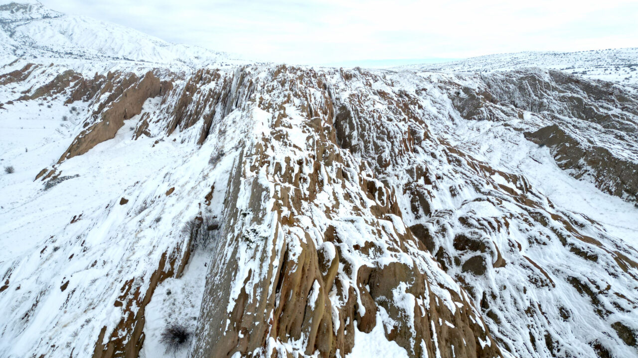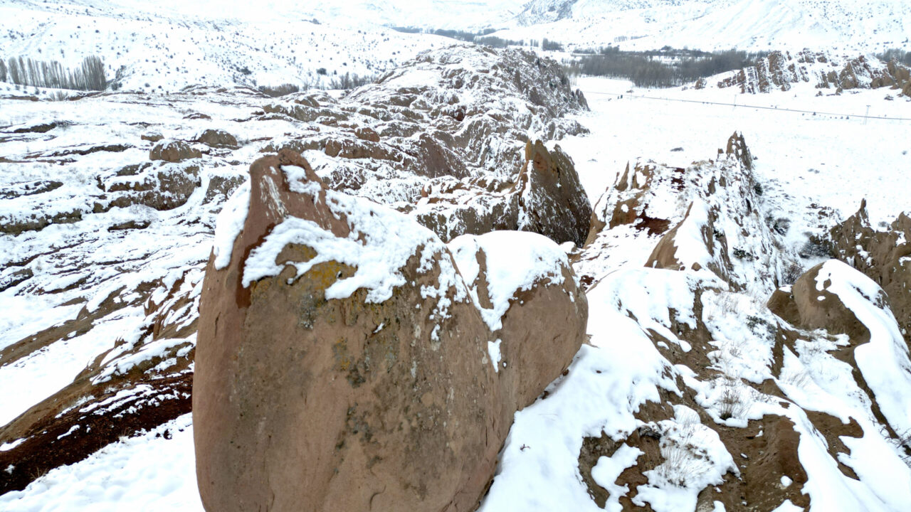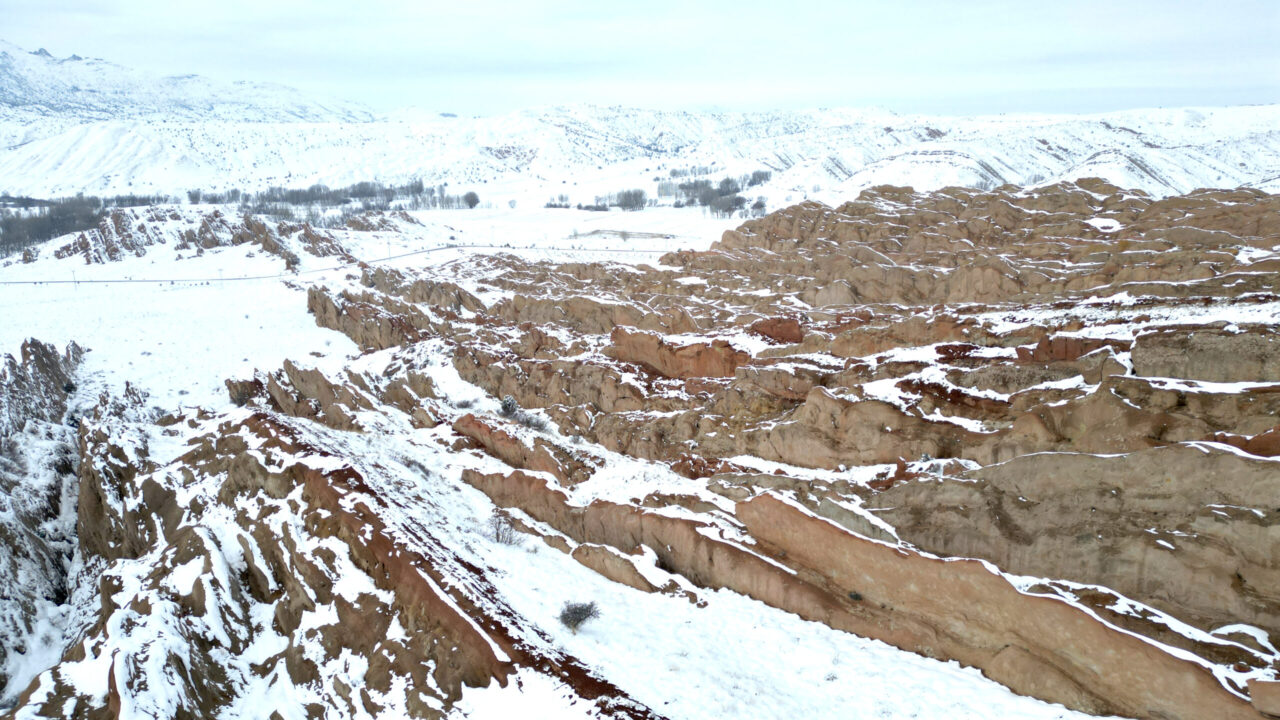 SİVAS kent merkezine 25 kilometre mesafedeki yer alan, kızıl görüntüsü ve doğal yapısı ile bilim insanları tarafından Mars yüzeyine benzetilen Eğribucak Kayalıkları, kar yağışı sonrası beyaz örtü ile kaplandı.