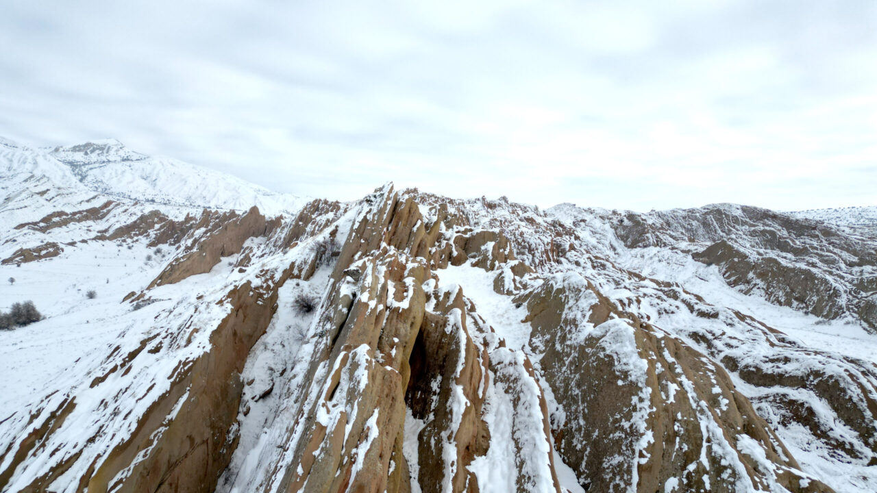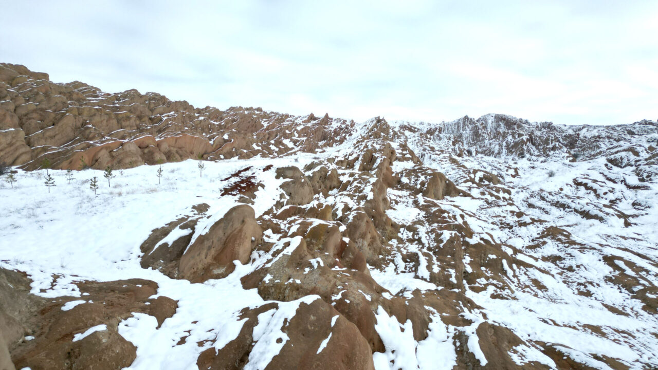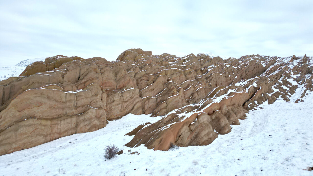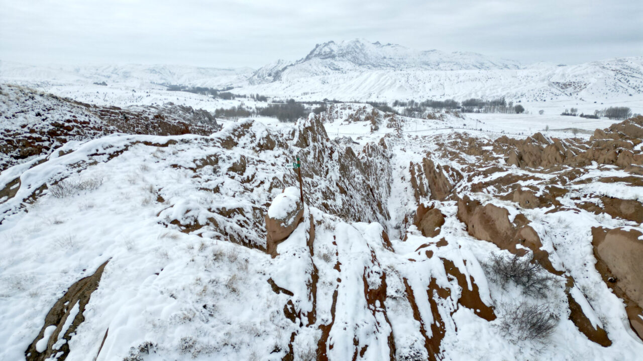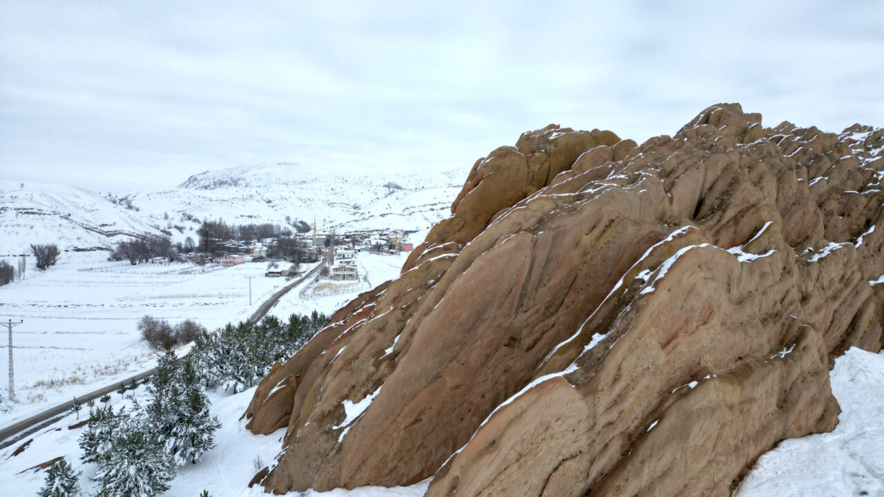 SİVAS kent merkezine 25 kilometre mesafedeki yer alan, kızıl görüntüsü ve doğal yapısı ile bilim insanları tarafından Mars yüzeyine benzetilen Eğribucak Kayalıkları, kar yağışı sonrası beyaz örtü ile kaplandı.