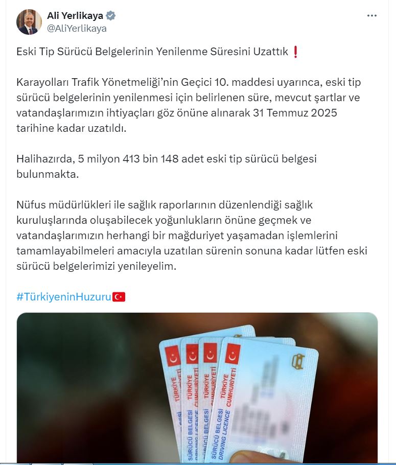 Bakan Yerlikaya, sosyal medya hesabından yaptığı açıklamada, “Karayolları Trafik Yönetmeliği’nin Geçici 10’uncu maddesi uyarınca, eski tip sürücü belgelerinin yenilenmesi için belirlenen süre, mevcut şartlar ve vatandaşlarımızın ihtiyaçları göz önüne alınarak 31 Temmuz 2025 tarihine kadar uzatıldı. Halihazırda, 5 milyon 413 bin 148 adet eski tip sürücü belgesi bulunmakta. Nüfus müdürlükleri ile sağlık raporlarının düzenlendiği sağlık kuruluşlarında oluşabilecek yoğunlukların önüne geçmek ve vatandaşlarımızın herhangi bir mağduriyet yaşamadan işlemlerini tamamlayabilmeleri amacıyla uzatılan sürenin sonuna kadar lütfen eski sürücü belgelerimizi yenileyelim” ifadelerini kullandı.