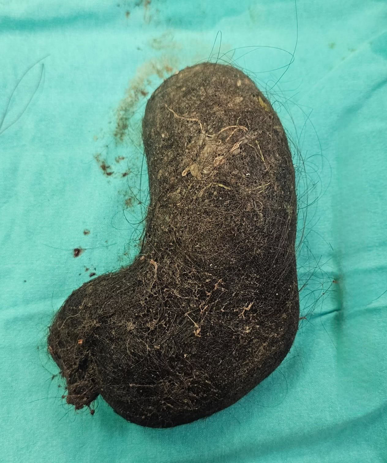 Mide ağrısı ve iştahsızlık şikayetleriyle hastaneye götürülen 9 yaşındaki B.G.’nin midesinden, uzun süreli saç yeme alışkanlığı sonucu oluşan büyük bir saç yumağı (bezoar) çıkarıldı.