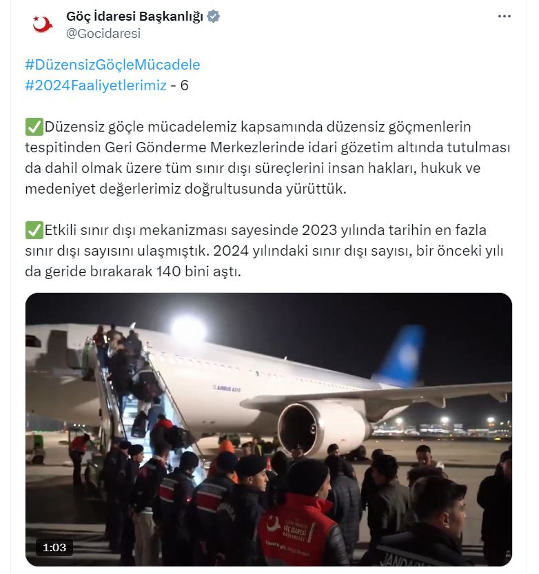 GÖÇ İdaresi Başkanlığı, 2024 yılında düzensiz göçle mücadele kapsamında sınır dışı edilen düzensiz göçmen sayısının 140 bini aştığını duyurdu.