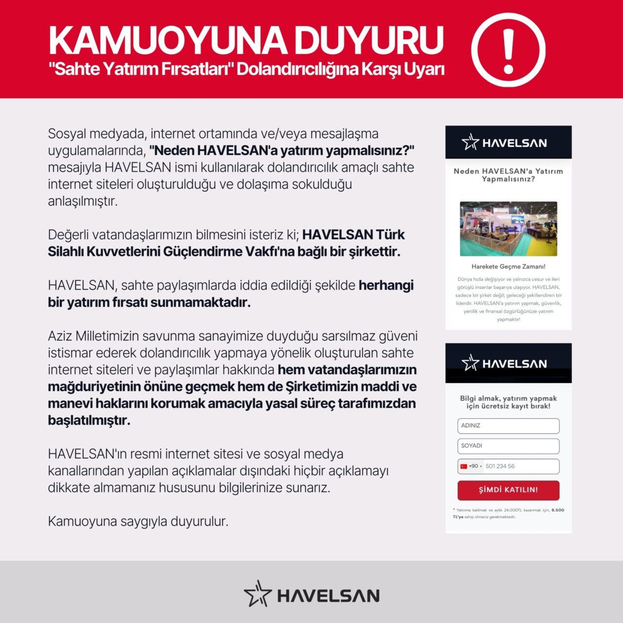 “Sosyal medyada, internet ortamında ve/veya mesajlaşma uygulamalarında, ‘Neden HAVELSAN’a yatırım yapmalısınız?’ mesajıyla HAVELSAN ismi kullanılarak dolandırıcılık amaçlı sahte internet siteleri oluşturulduğu ve dolaşıma sokulduğu anlaşılmıştır. Değerli vatandaşlarımızın bilmesini isteriz ki; HAVELSAN Türk Silahlı Kuvvetlerini Güçlendirme Vakfı’na bağlı bir şirkettir. HAVELSAN, sahte paylaşımlarda iddia edildiği şekilde herhangi bir yatırım fırsatı sunmamaktadır. Aziz Milletimizin savunma sanayimize duyduğu sarsılmaz güveni istismar ederek dolandırıcılık yapmaya yönelik oluşturulan sahte internet siteleri ve paylaşımlar hakkında hem vatandaşlarımızın mağduriyetinin önüne geçmek hem de şirketimizin maddi ve manevi haklarını korumak amacıyla yasal süreç tarafımızdan başlatılmıştır.