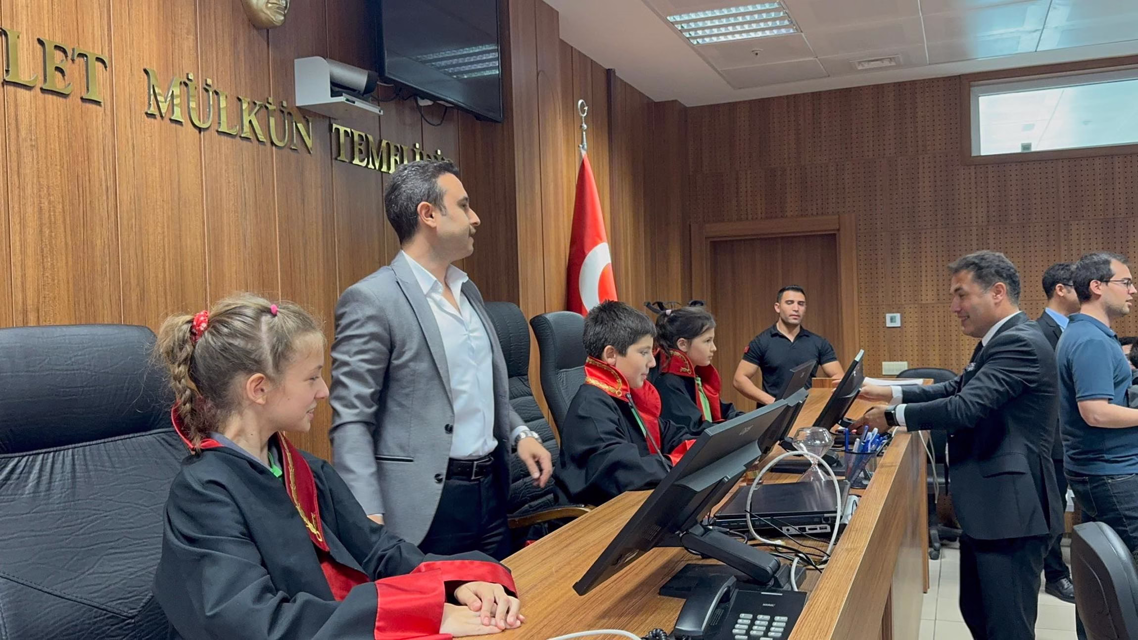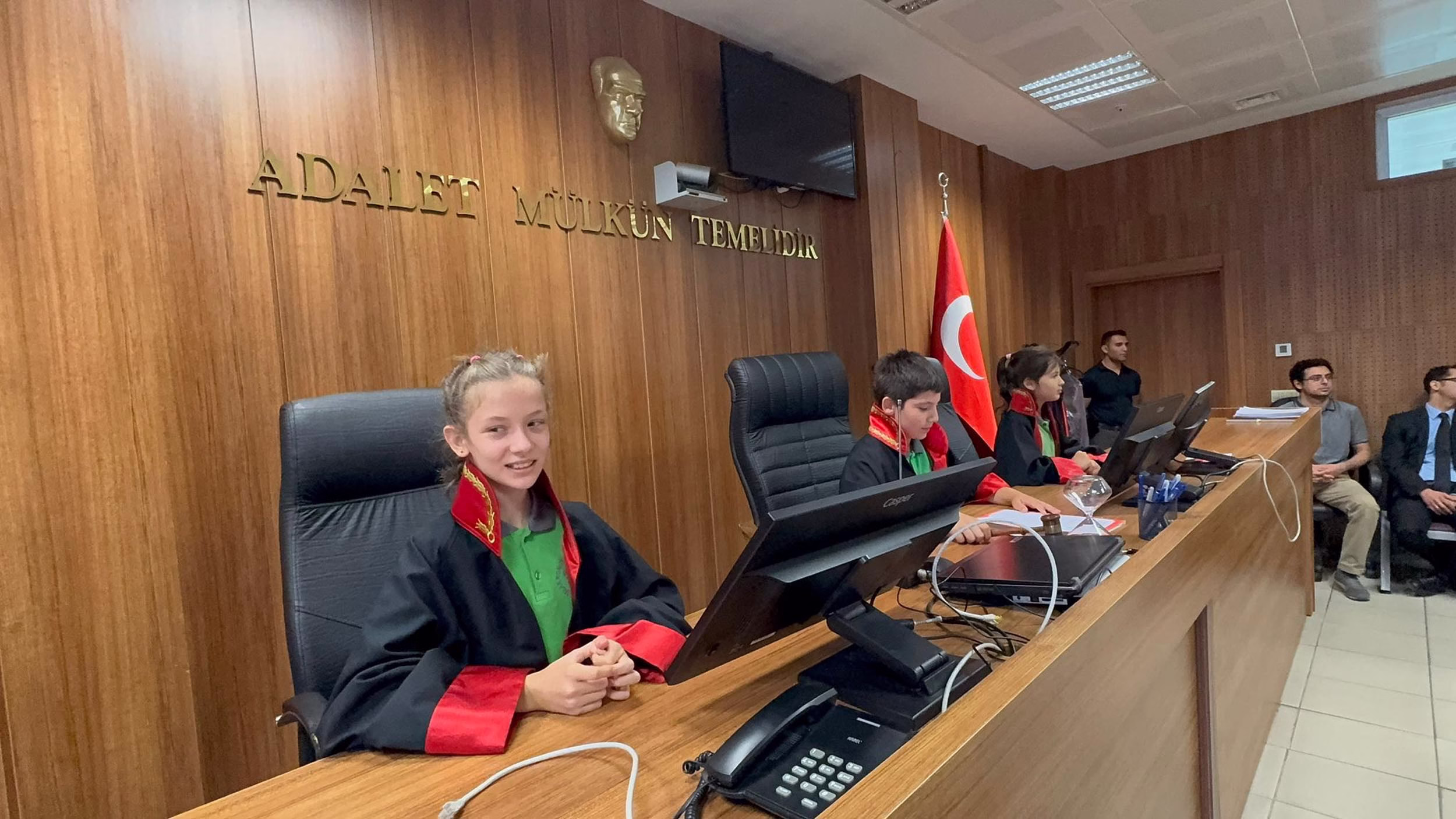 Tekirdağ’ın Çorlu ilçesindeki Emlak Konut Ergene Vadisi İlkokulu öğrencileri, Milli Eğitim Bakanlığı’nın ‘Türkiye Yüzyılı Maarif Modeli’ kapsamında ziyaret ettikleri adliyede duruşma canlandırdı.