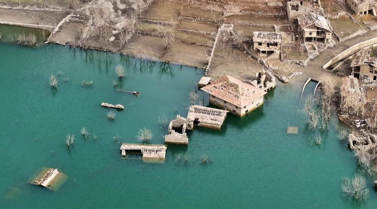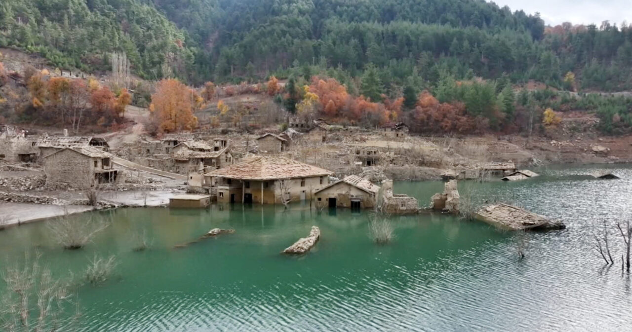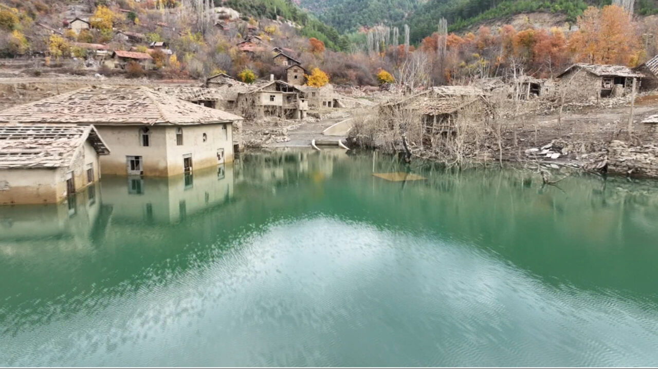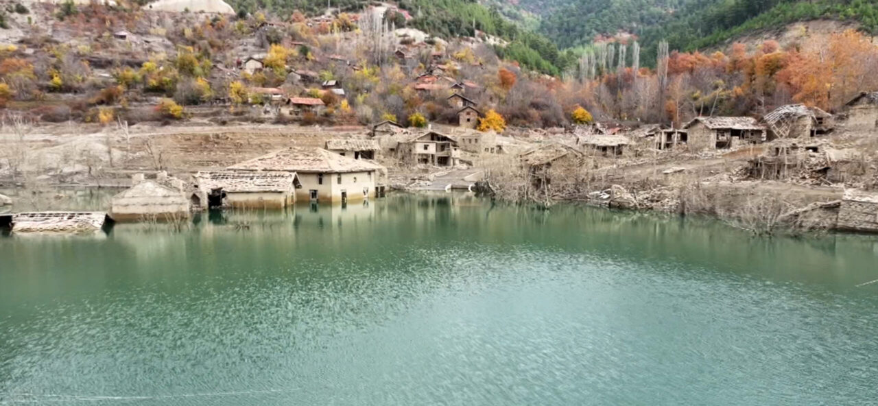 Sonbahar mevsiminde dalları kurumaya başlayan ağaçların çevrelediği köyde, su seviyesinin azalmasıyla ortaya çıkan taş evler, cami, elektrik nakil hatlarıyla bazı sokaklar, seyirlik görüntü oluşturdu.