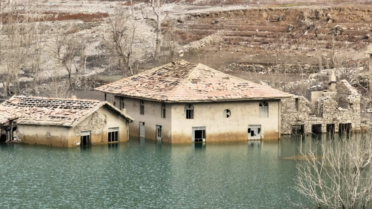 Isparta’da ‘batık köy’ adıyla bilinen Darıbükü’ndeki taş evler su seviyesinin azalmasıyla gün yüzüne çıktı.