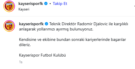 Süper Lig temsilcisi Kayserispor, teknik direktör Radomir Djalovic ile karşılıklı anlaşarak yollarını ayırdığını duyurdu.