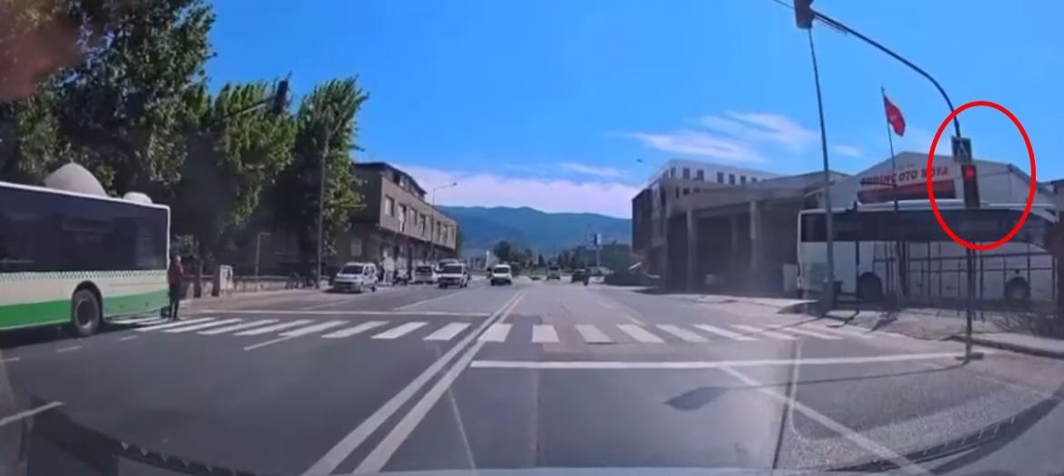 Olay, o an karşı şeritte kırmızı ışıkta bekleyen bir sürücünün araç içi kamerası tarafından kaydedildi. Görüntülerde minibüsün kırmızı ışık ihlali yaptığı, ters şeritten geçtiği ve yayaları tehlikeye attığı net şekilde görülüyor.