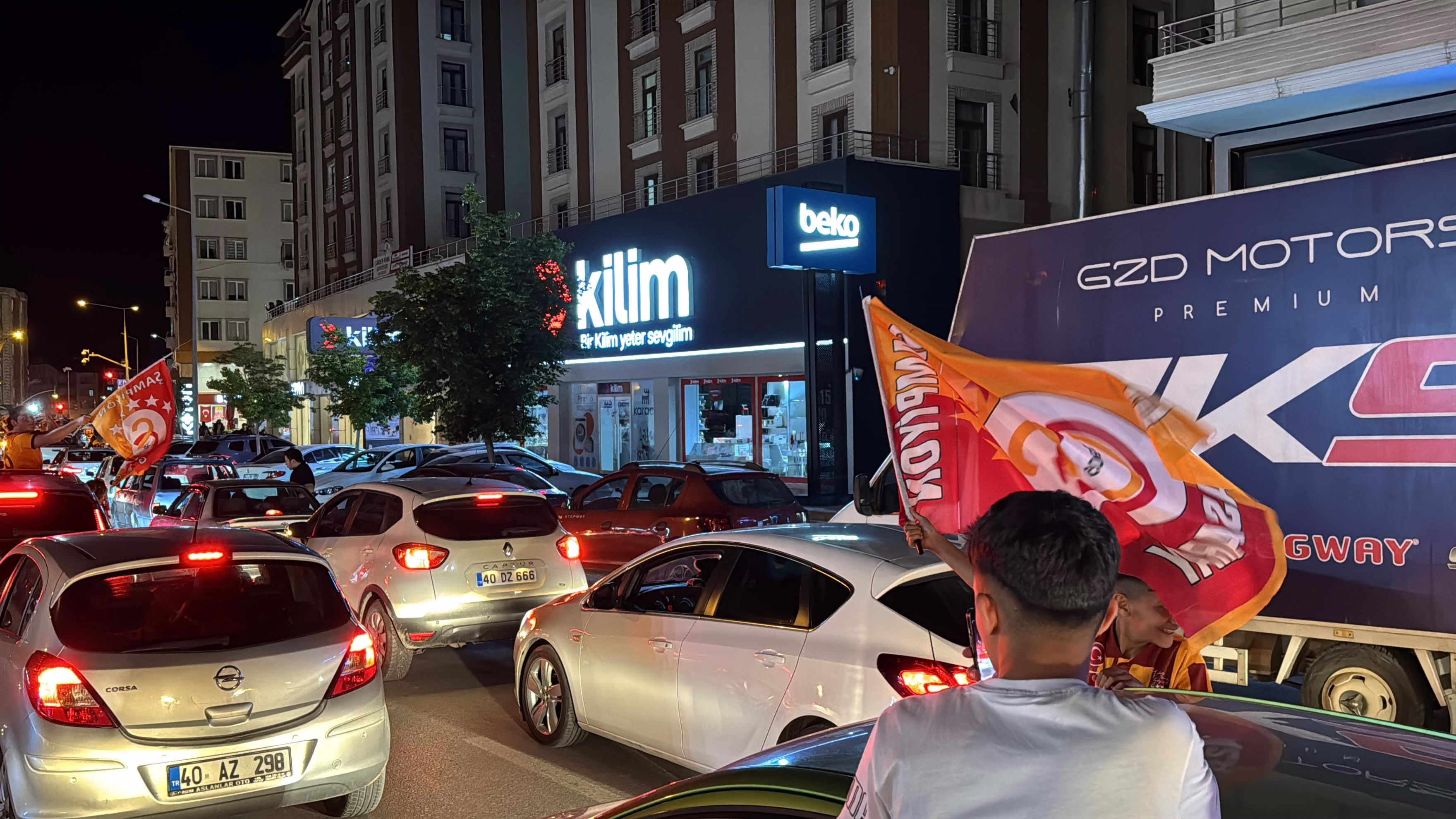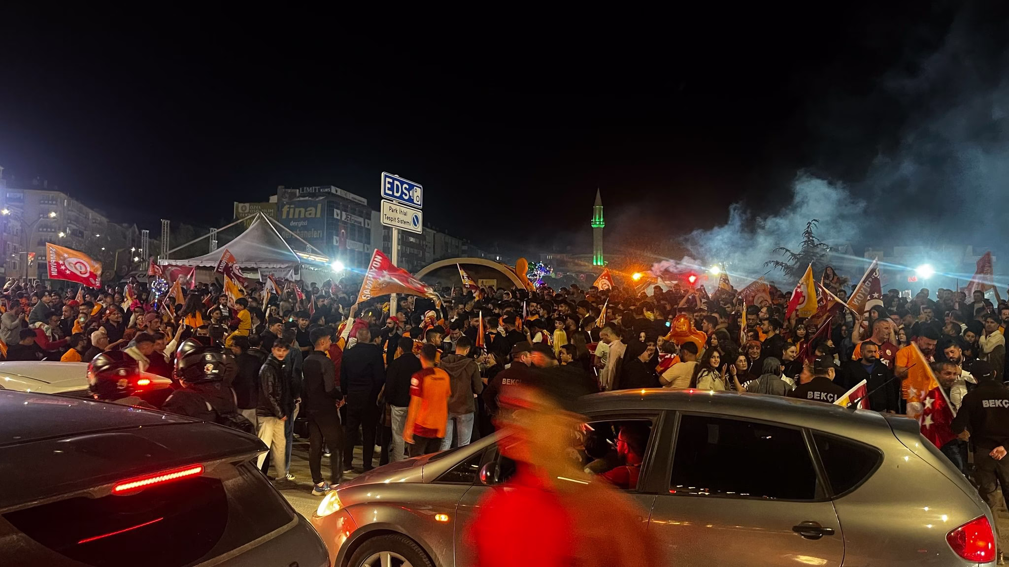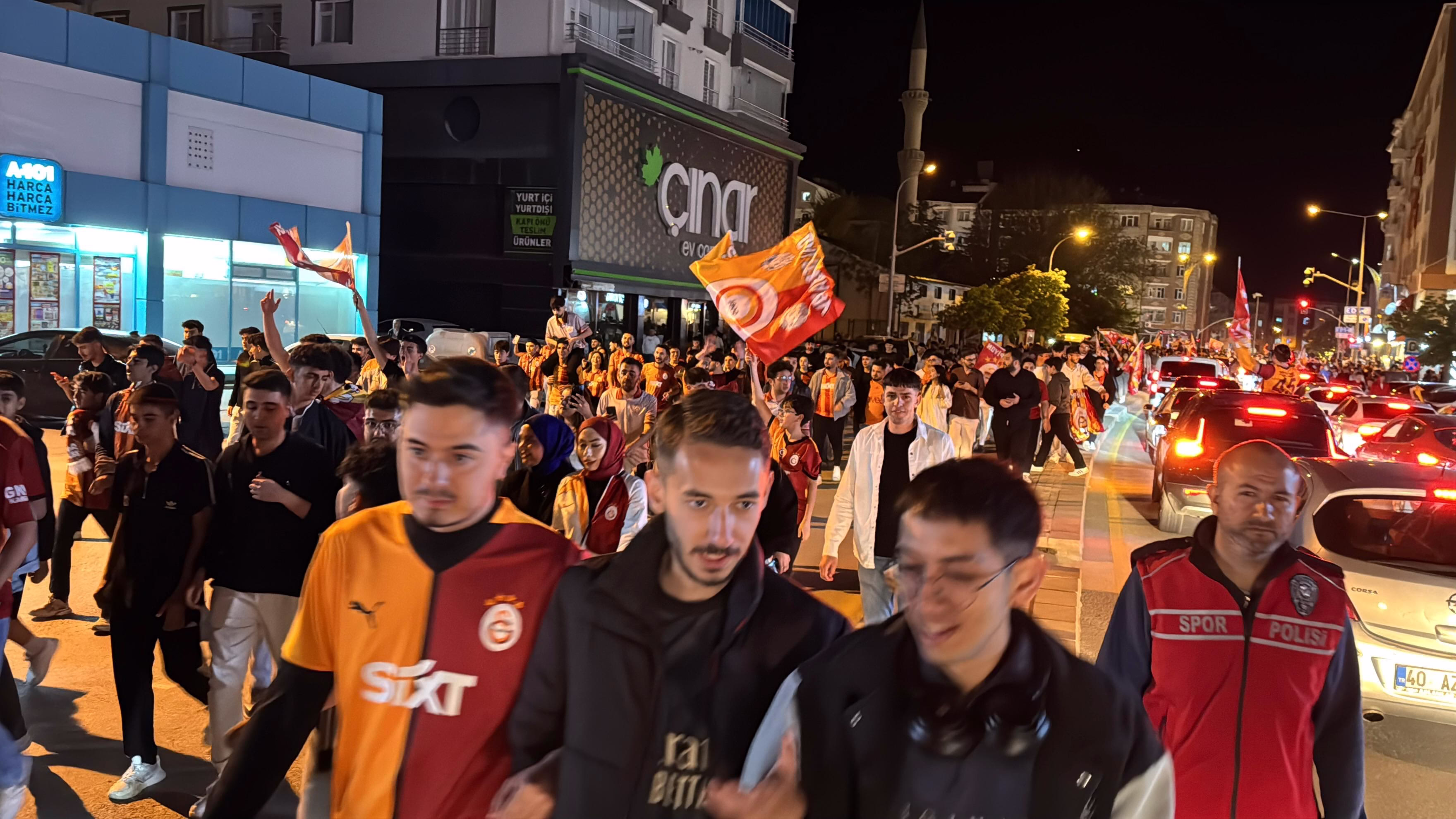 Galatasaray’ın şampiyonluk zaferinin ardından Kırşehir’deki taraftarlar araçlarıyla ve yaya olarak Cacabey Meydanı’na akın etti. Ellerinde dev Galatasaray bayrakları taşıyan kalabalık, “Şampiyon Aslanlar” tezahüratlarıyla meydanı doldurdu.