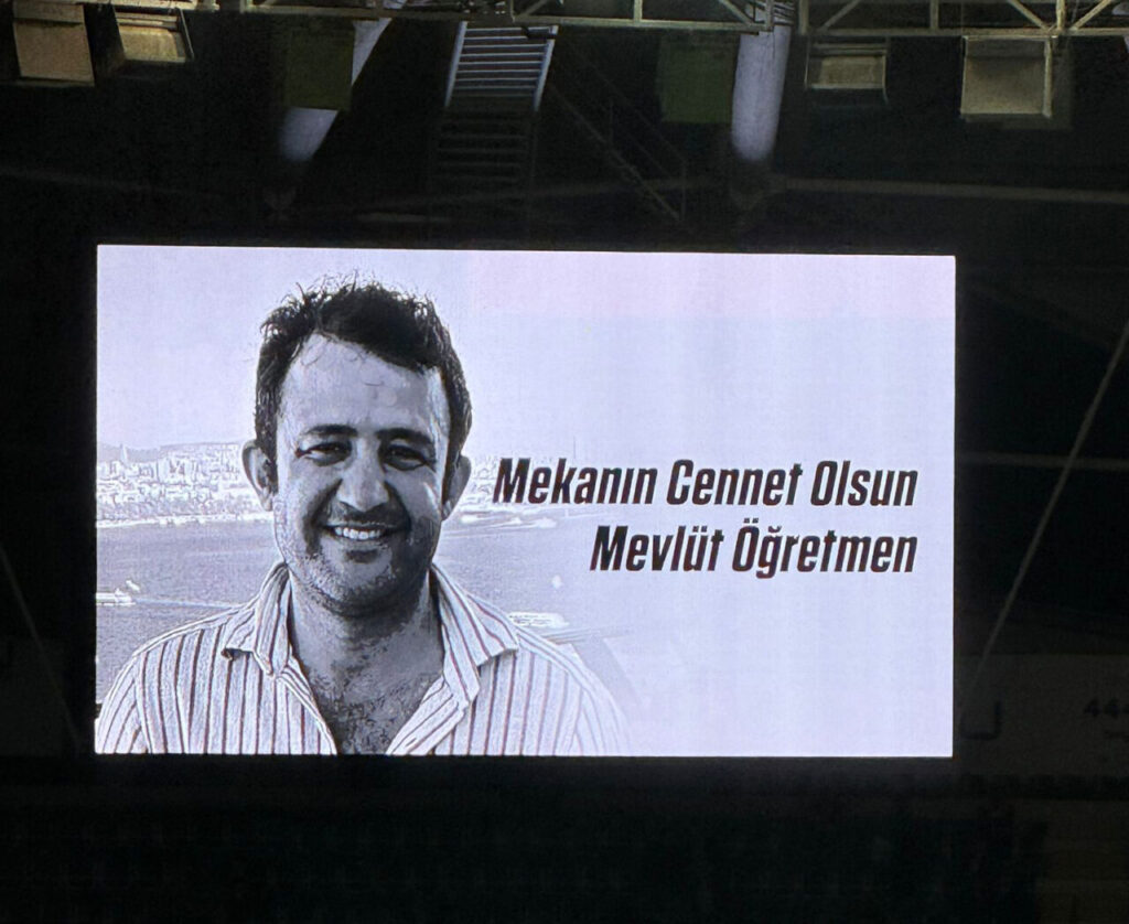 Tribünlerdeki büyük ekranda “Mekanın cennet olsun Mevlüt öğretmen” mesajı ve Külcü’nün fotoğrafı yer alınca stadyumda duygusal anlar yaşandı.