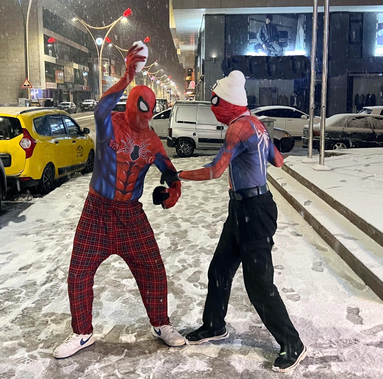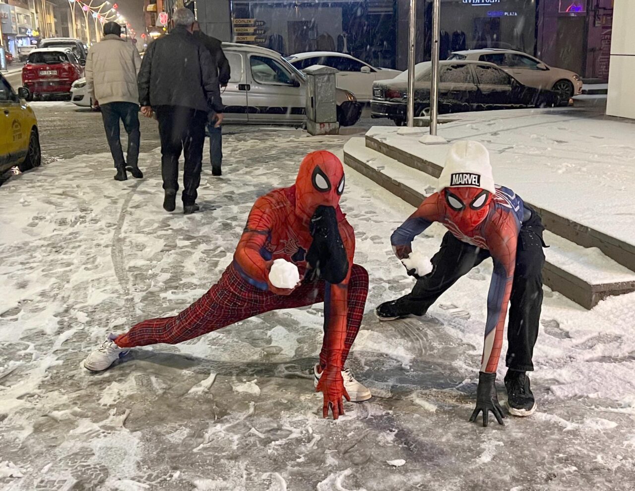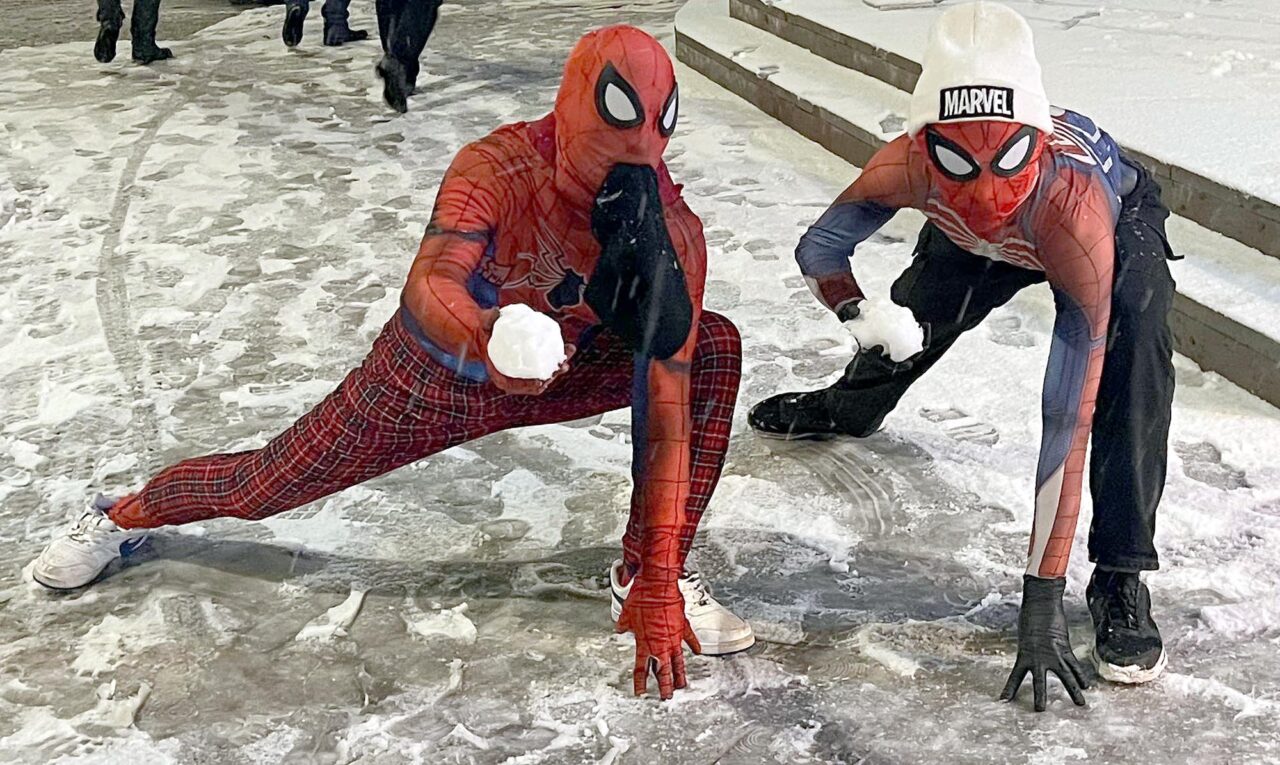 Türkiye’yi gezme hayaliyle memleketi İzmir’den ‘Örümcek Adam’ kostümüyle yola çıkan Ayaz Salih Koç (25), 62’nci durağı olan Erzincan’da kendisi gibi ‘Örümcek Adam’ kostümüyle dolaşan Asaf Özdemir (16) ile karşılaştı. Taraflar kısa süreli şaşkınlığın ardından yağan lapa lapa kar altında kar topu savaşı yaptı, ardından da birbirine sarıldı.