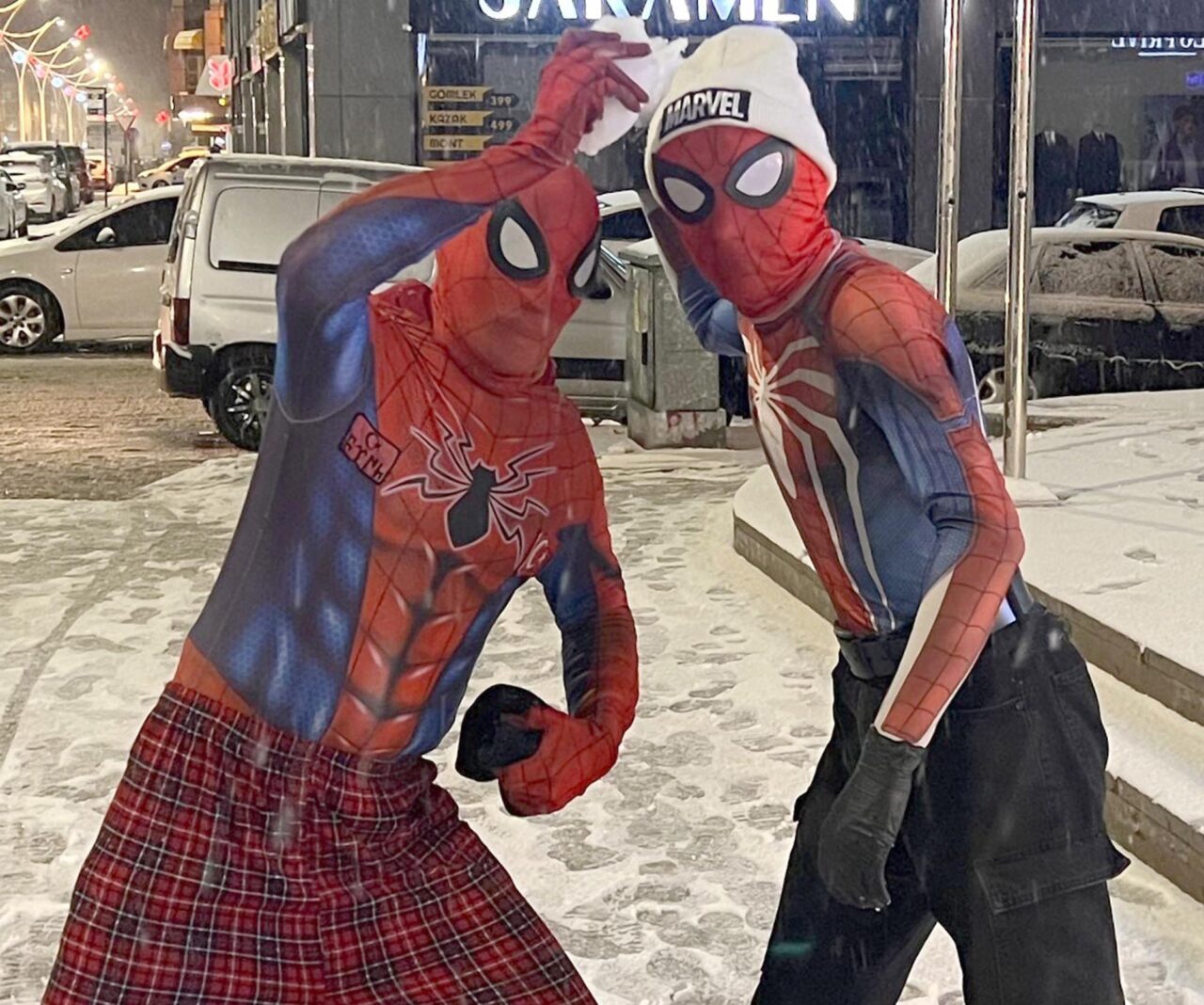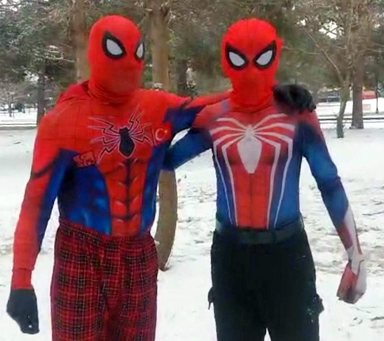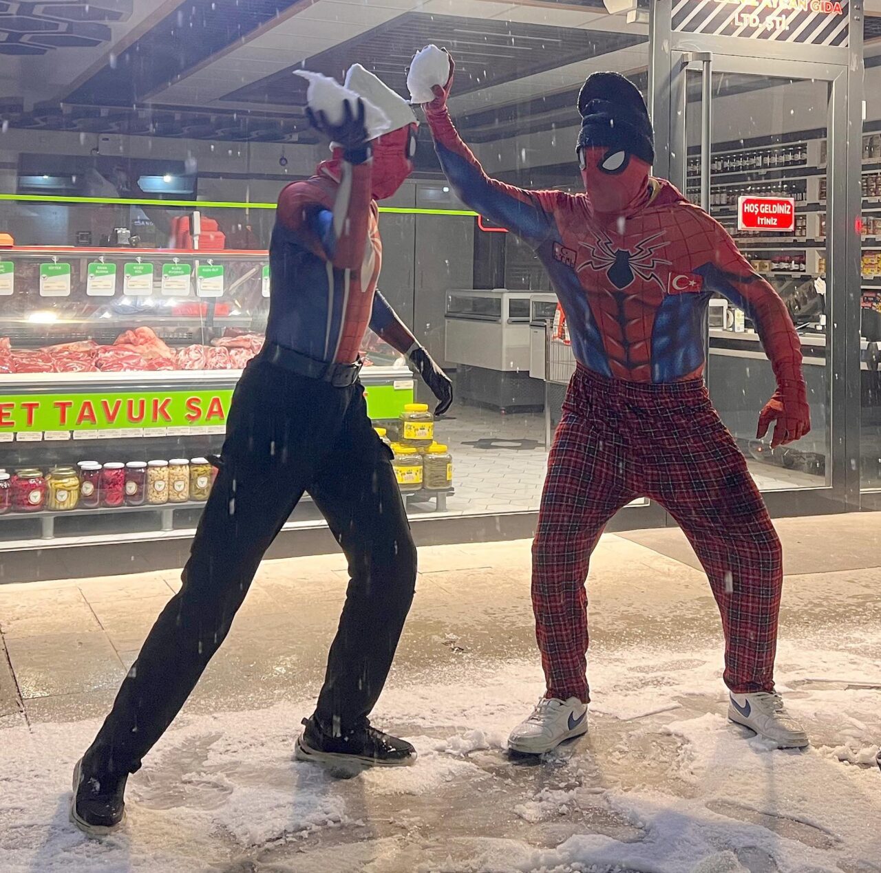 Türkiye’yi gezme hayaliyle memleketi İzmir’den ‘Örümcek Adam’ kostümüyle yola çıkan Ayaz Salih Koç (25), 62’nci durağı olan Erzincan’da kendisi gibi ‘Örümcek Adam’ kostümüyle dolaşan Asaf Özdemir (16) ile karşılaştı. Taraflar kısa süreli şaşkınlığın ardından yağan lapa lapa kar altında kar topu savaşı yaptı, ardından da birbirine sarıldı.