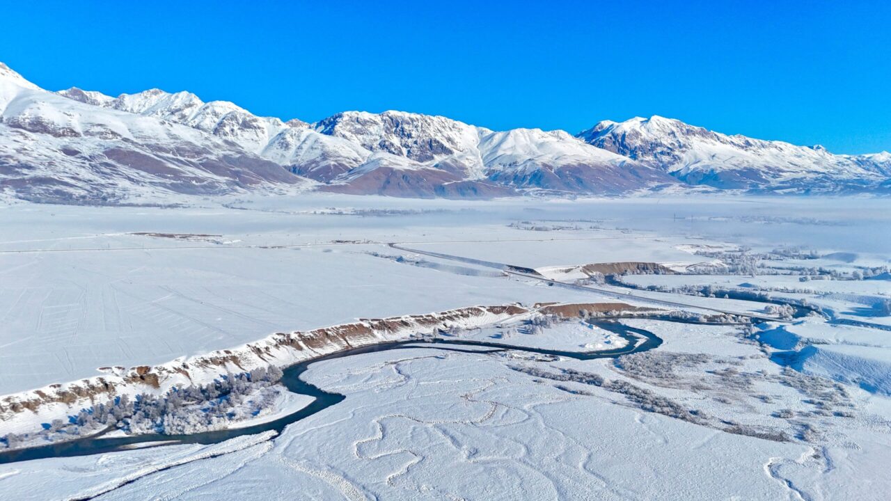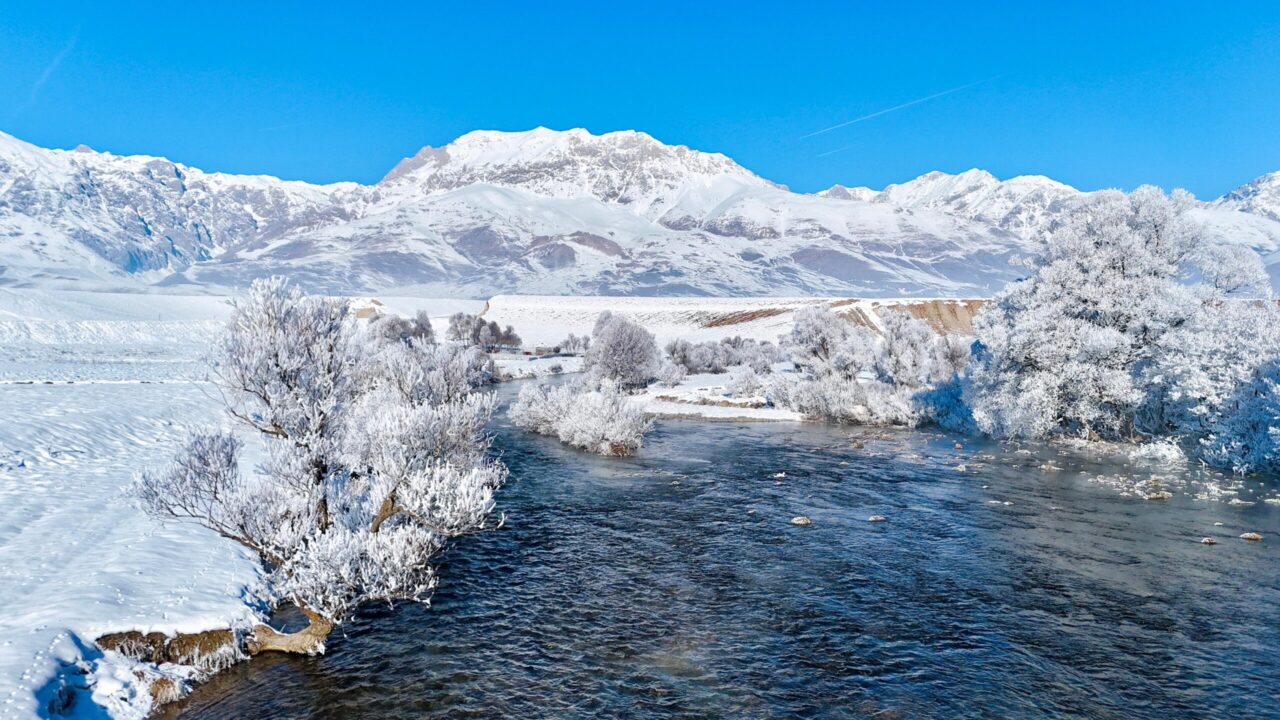 Tunceli’nin Munzur ile Mercan dağları arasındaki Ovacık ilçesi, kar yağışıyla beyaza büründü. Dağlar ve ağaçların, gökyüzü ve Munzur Nehri ile oluşturduğu seyirlik manzara, havadan görüntülendi.