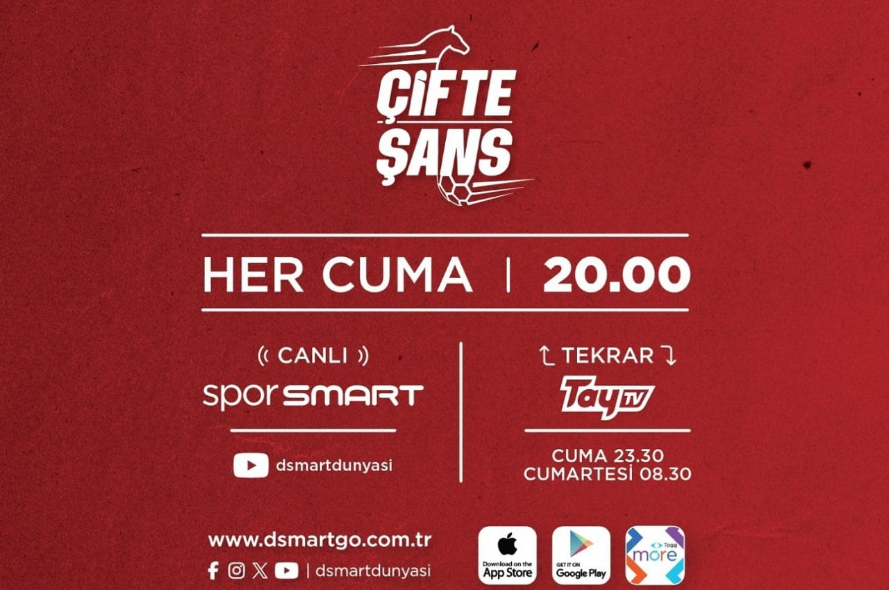 Çifte Şans, 8 Kasım Cuma saat 20.00’de yayın hayatına başlayacak ve her cuma akşamı aynı saatte izleyicilerle buluşacak. Çifte Şans programını Türkiye’nin yenilikçi dijital platformu D-Smart 77. Kanal Spor Smart, D-Smart GO ve aynı anda @dsmartdunyasi youtube kanalından canlı izleyebileceksiniz. Programı canlı izleyemeyen sporseverler tekrarını cuma akşamları 23.30’da TAY TV’de seyredebilecek. Çifte Şans programını izlerken merak edilenler, maçlar ve koşularla ilgili görüşler interaktif iletişim imkanı ile Youtube’de @dsmartdunyasi hesabında sohbet bölümünden, X, instagram ve facebook’ta @CifteSansSS hesaplarından ulaşılabilecek.