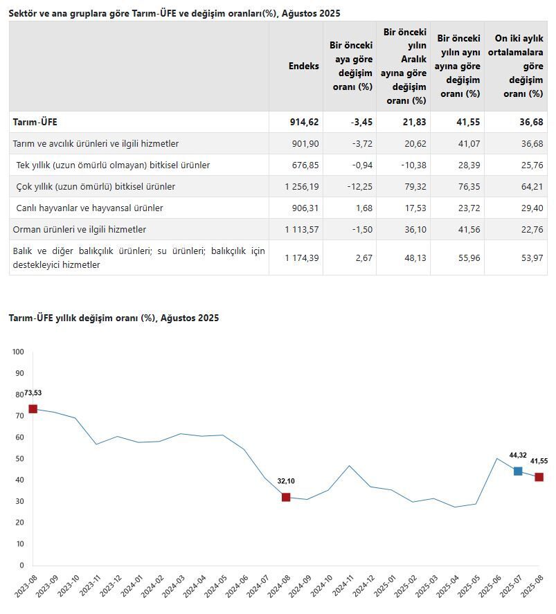 TÜİK verilerine göre tarım ürünleri üretici fiyatları, Ağustos 2025’te yıllık bazda yüzde 41,55 artarken, aylık bazda yüzde 3,45 azaldı.