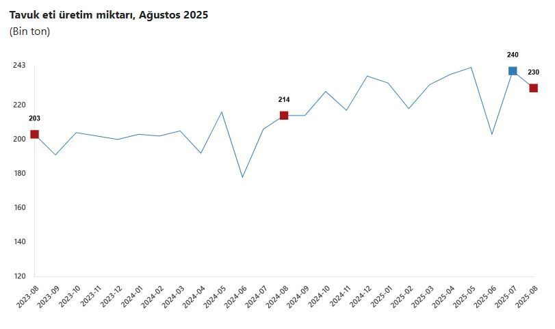 TÜİK’in yayımladığı kümes hayvancılığı ve süt üretimi istatistiklerine göre; temmuz ayında 239 bin 876 ton olan tavuk eti üretimi, ağustosta %4,1 azalarak 229 bin 965 tona düştü.