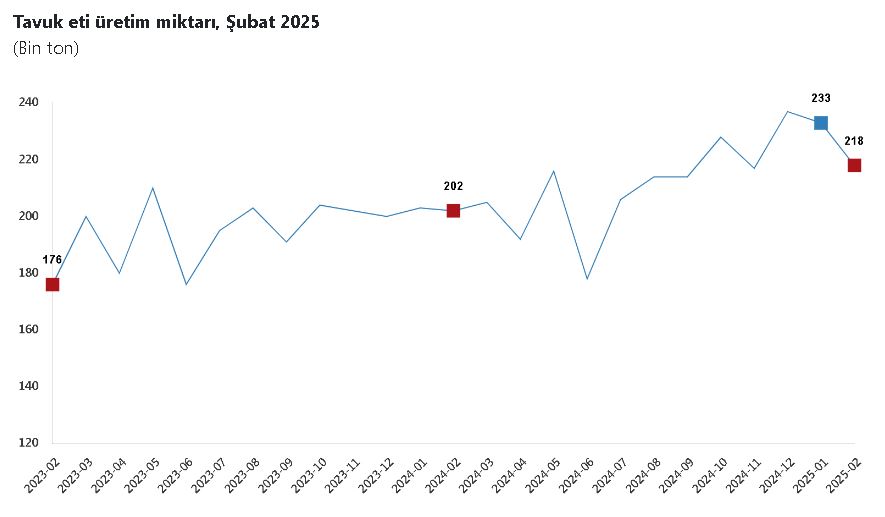 Ocak-Şubat dönemine bakıldığında ise geçen yılın aynı dönemine göre tavuk yumurtası üretiminde yüzde 10,4’lük bir azalma görülürken, kesilen tavuk sayısı yüzde 8,8, tavuk eti üretimi ise yüzde 11,5 oranında artış gösterdi.