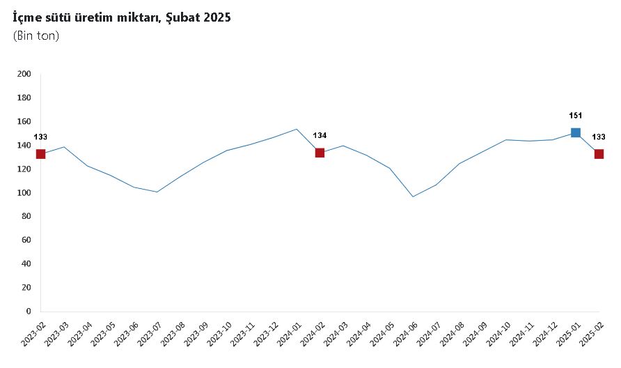 Aynı dönemde süt ürünleri üretiminde de karışık bir seyir izlendi. Şubat 2024’e kıyasla inek peyniri üretiminde kayda değer bir değişim görülmezken, ayran ve kefir üretimi yüzde 6,9, yoğurt üretimi yüzde 4,6 oranında arttı. İçme sütü üretimi yüzde 0,6, tereyağı ve sadeyağ üretimi ise yüzde 1,5 oranında azaldı.