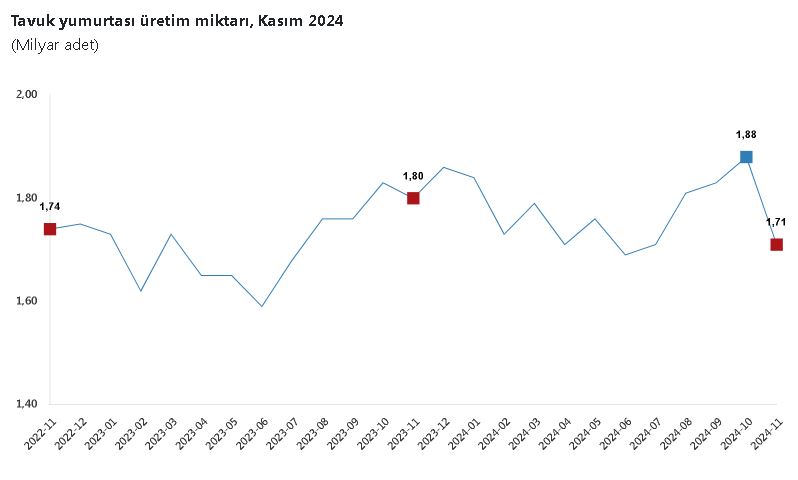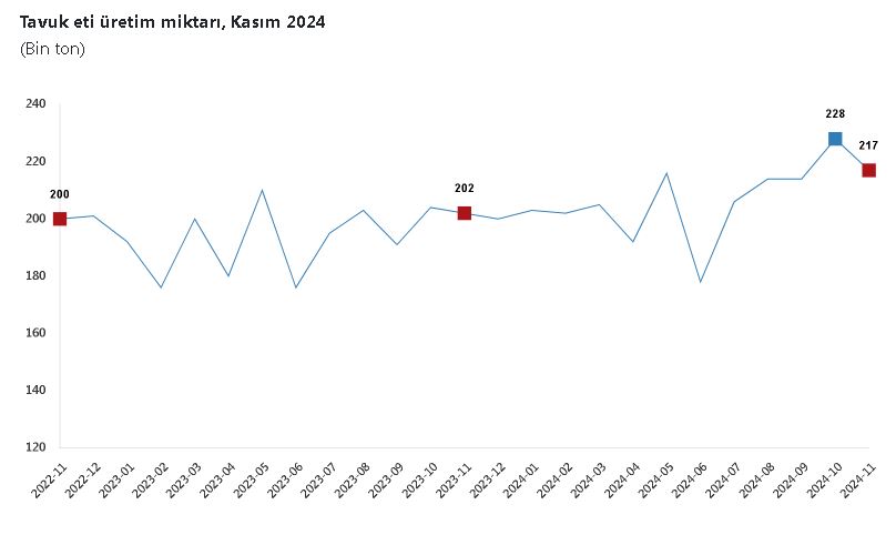 TÜİK, Kasım 2024 dönemine ilişkin kümes hayvancılığı ile süt ve süt ürünleri üretimi verilerini açıkladı. Buna göre; tavuk eti üretimi, kasım ayında bir önceki aya göre yüzde 4,8 oranında azalarak 216 bin 754 ton oldu. Tavuk yumurtası üretimi de bir önceki aya göre yüzde 9,1 azalarak 1 milyar 710 milyon 852 bin adet oldu. Kasım ayında bir önceki yılın aynı ayına göre, tavuk yumurtası üretimi yüzde 4,9 azaldı, kesilen tavuk sayısı yüzde 5,6 arttı, tavuk eti üretimi yüzde 7,2 arttı. Ocak-Kasım 2024 döneminde bir önceki yılın aynı dönemine göre, tavuk yumurtası üretimi yüzde 3,6 arttı, kesilen tavuk sayısı yüzde 7 arttı, tavuk eti üretimi yüzde 6,9 arttı.