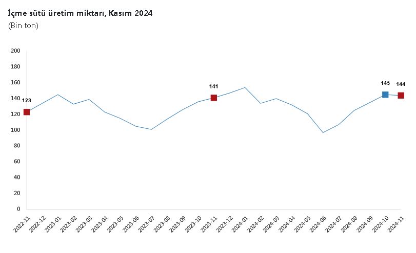 Kasım ayında ticari süt işletmelerince toplanan inek sütü miktarı, bir önceki aya göre yüzde 2,7 oranında azalarak 896 bin 257 ton oldu. İçme sütü üretimi ise bir önceki yüzde 1 oranında azalarak 143 bin 604 ton olarak gerçekleşti. Ticari süt işletmeleri tarafından toplanan inek sütü miktarı, kasım ayında bir önceki yılın aynı ayına göre yüzde 10,6 arttı, ocak-kasım döneminde ise bir önceki yılın aynı dönemine göre yüzde 10,1 arttı. Kasım ayında bir önceki yılın aynı ayına göre, inek peyniri üretimi yüzde 5,8 arttı, ayran üretimi yüzde 6,5 arttı, yoğurt üretimi yüzde 1,6 arttı, içme sütü üretimi yüzde 1,9 arttı, tereyağı üretimi yüzde 35,7 arttı. Ocak-Kasım 2024 döneminde ise bir önceki yılın aynı dönemine göre, inek peyniri üretimi yüzde 6,2 arttı, ayran üretimi yüzde 12,6 arttı, yoğurt üretimi yüzde 6,8 arttı, içme sütü üretimi yüzde 3,9 arttı, tereyağı üretimi yüzde 15,2 arttı.