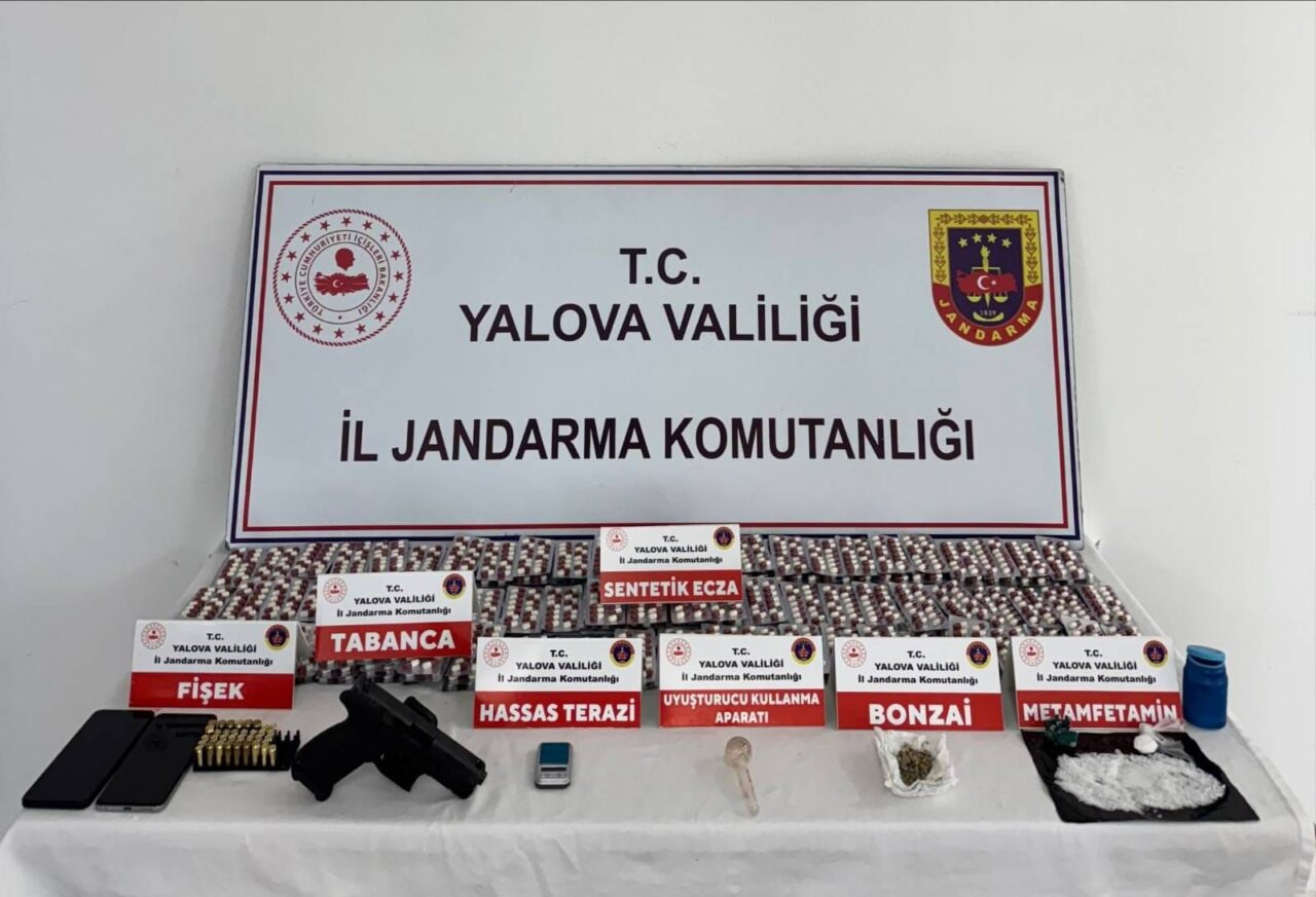 Yalova’da uyuşturucu madde ticareti yapıldığı ihbarı üzerine İl Jandarma Komutanlığı ekipleri harekete geçti. Termal ilçesinde ikamet ettikleri tespit edilen 5 şüpheliye yönelik operasyon yapıldı. Operasyonda, S.K., O.K., R.D., S.İ. ve H.K. isimli şüpheliler yakalanarak gözaltına alındı. Şüphelilerin ev ve araçlarında yapılan aramalarda, 2 bin 366 adet sentetik ecza hap, 23 gram metamfetamin, 1 adet hassas terazi, 1 adet uyuşturucu kullanma aparatı, 1 adet tabanca, 41 adet tabanca fişeği, 2 adet cep telefonu ele geçirildi. Gözaltına alınan ve yasal işlemlerin ardından mahkemeye sevk edilen 5 şüpheliden S.K. tutuklanırken, 4 şüpheli adli kontrol şartı ise serbest bırakıldı. (DHA)