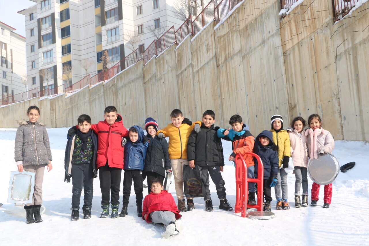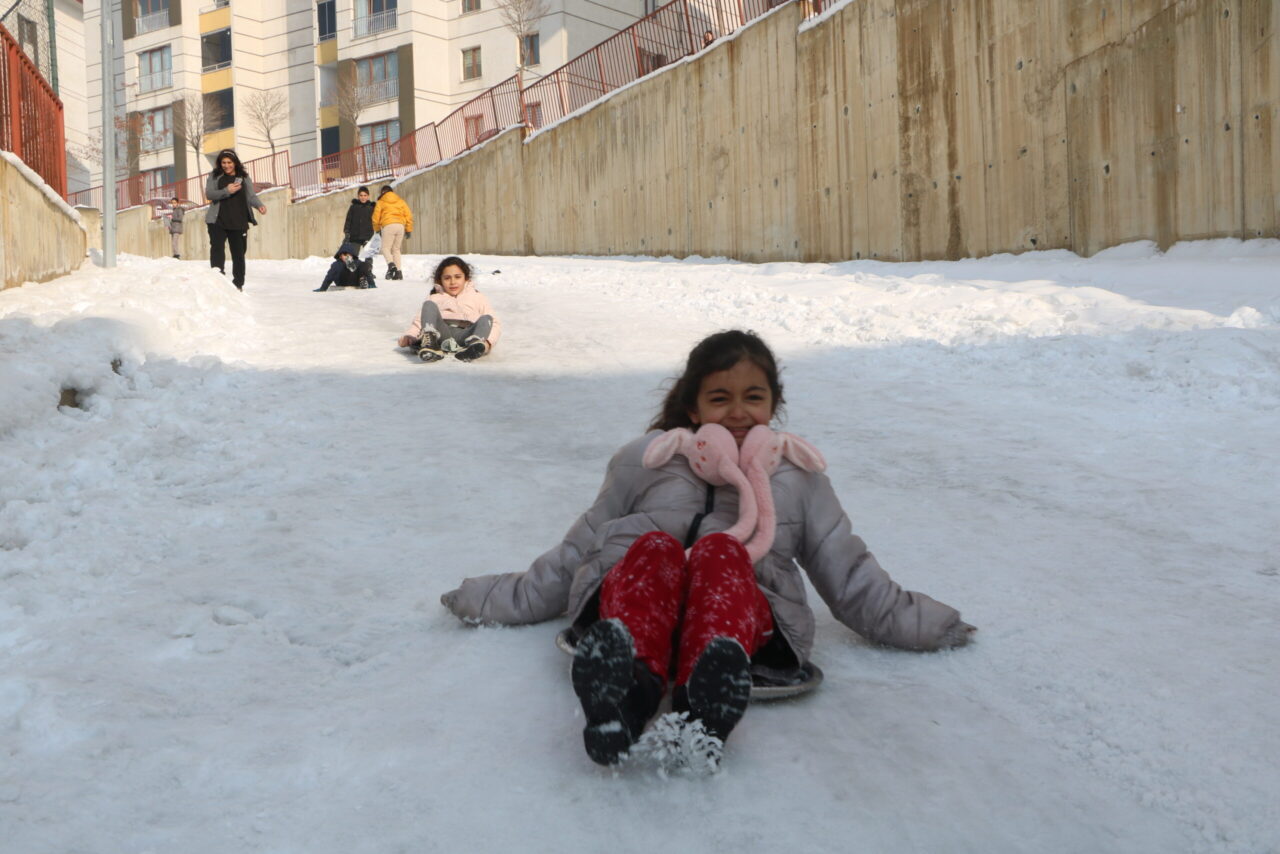 Tepsiyle kayan Eda Babat, kar yağışına çok sevindiklerini belirterek, “Hafta sonumuzu kayak yaparak geçiriyoruz. Bizim için eğlence kaynağı oldu. Birçok arkadaşımız evlerinde getirdikleri yemek tepsisi, kızak, naylon ve bidonlarla yokuştan aşağıya doğru kayıyor. Hep birlikte eğlenip mutlu oluyoruz” dedi.